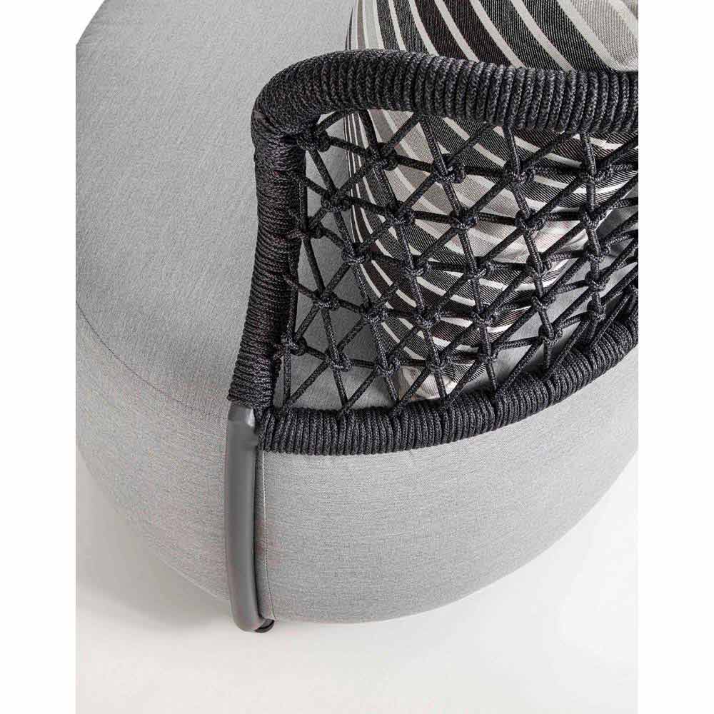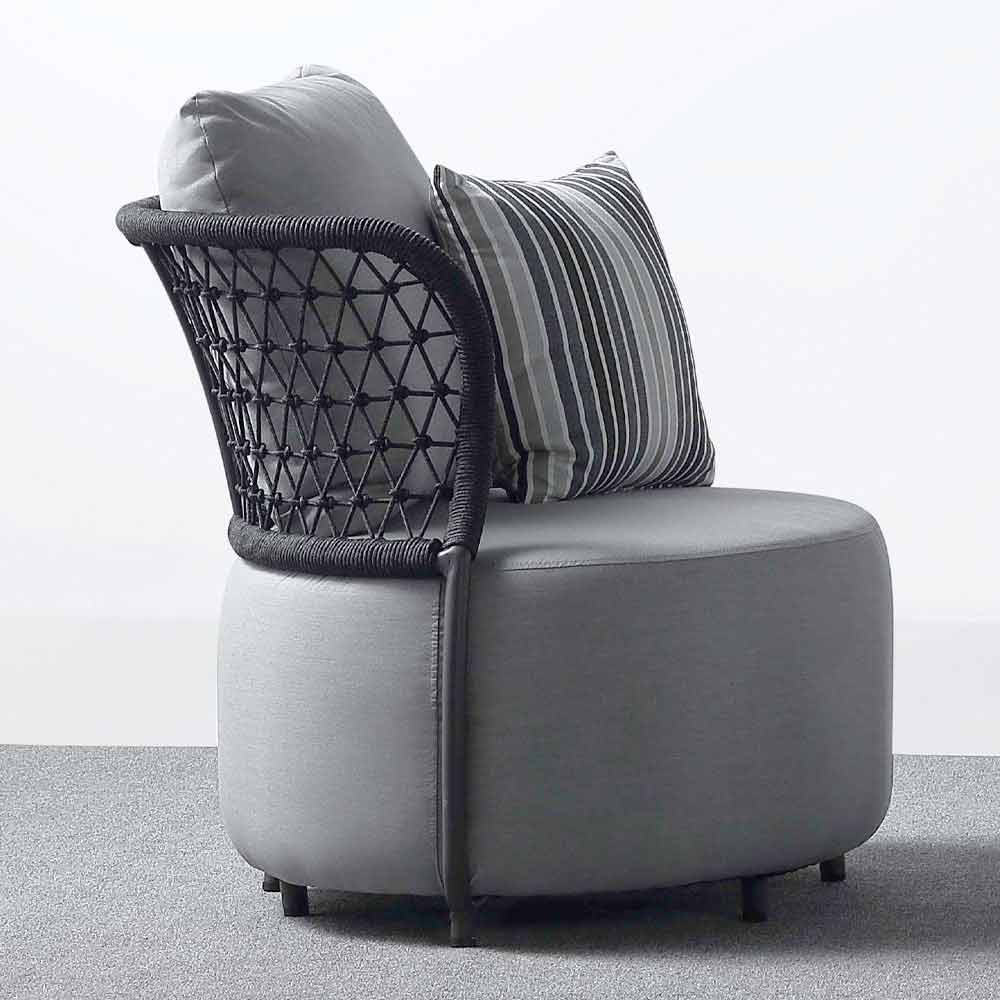 Garden armchair made in painted aluminum e anthracite finish network with seat and back cushion covered in gray water-repellent fabric . Ideal for giving life to a modern and exclusive furniture , this complement embodies all the fundamental characteristics of the perfect outdoor armchair as it ensures a comfortable and particularly welcoming seat together with an innovative design with an original taste . The unprecedented combination of different materials and textures also gives a strong personality to the aesthetics of the product, enriching it in a unique and avant-garde way.