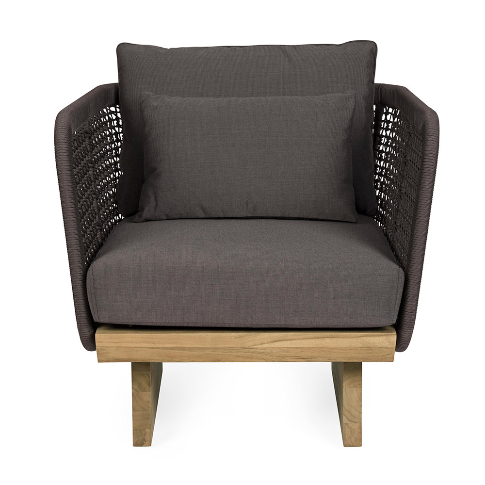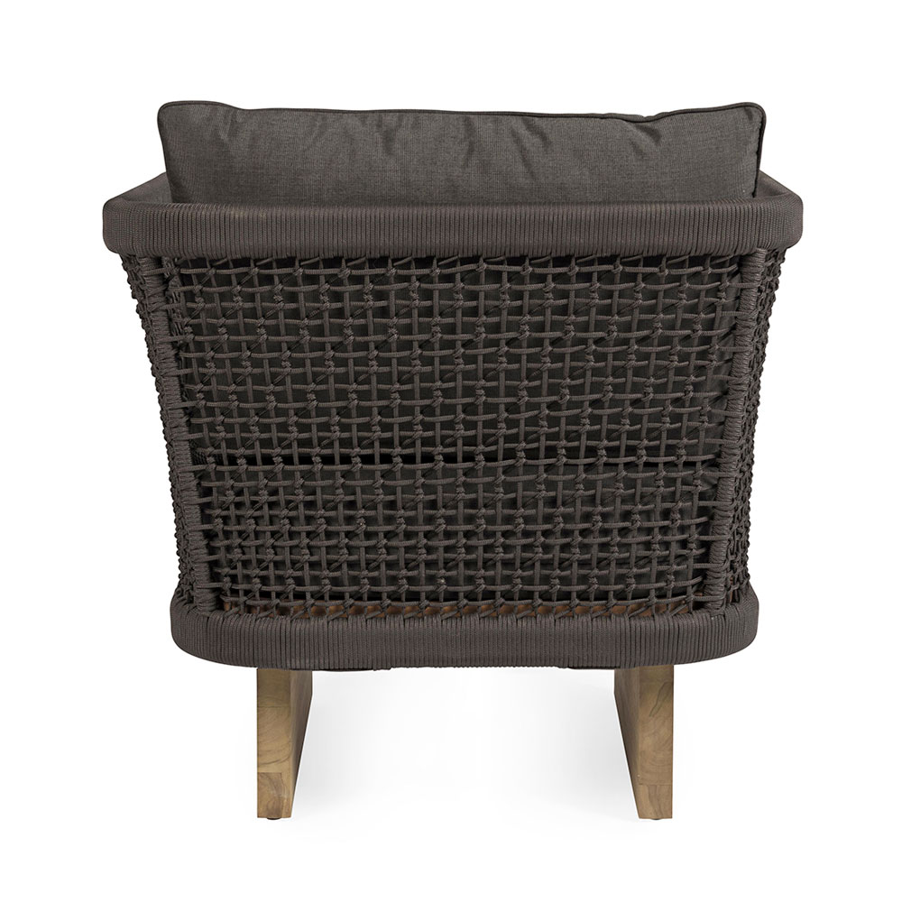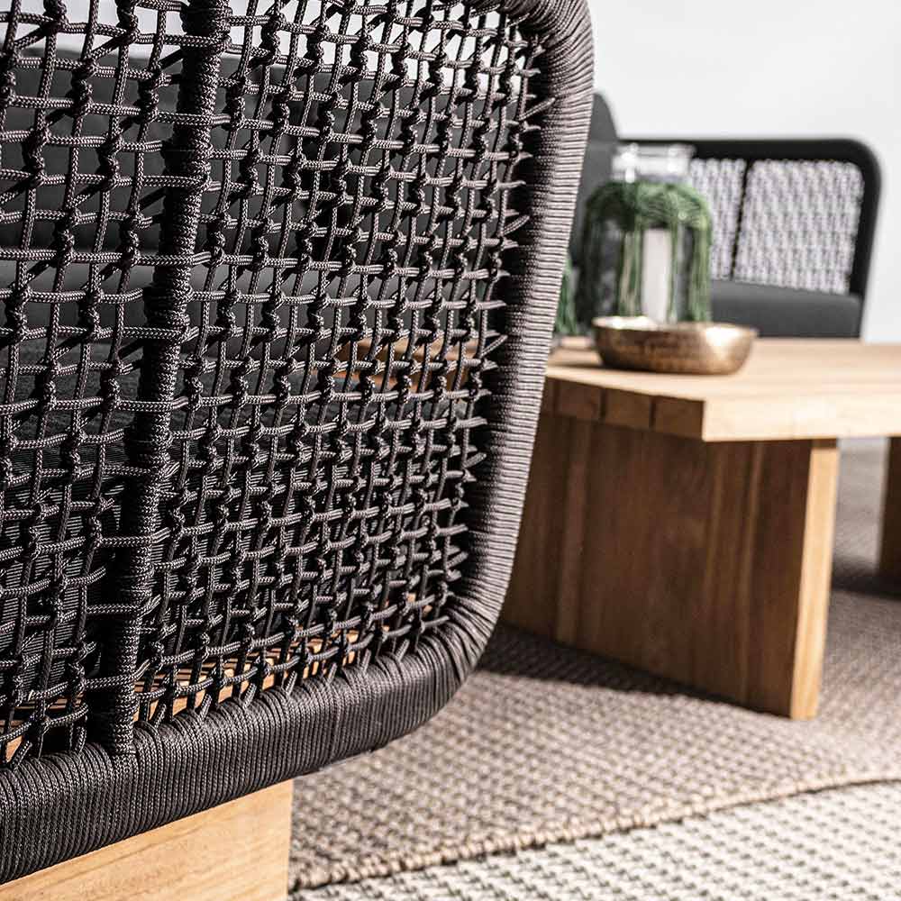 Powder coated aluminum structure (polyester). Seat and legs in teak - SVLK (certified wood from sustainable forests) with a rustic finish. Woven for outdoor use in rope (polypropylene), water repellent and UV resistant. Removable cushions with sunbrella fabric (100% acrylic), water repellent and UV resistant. Quick dry foam padding for outdoor use (anti-humidity).