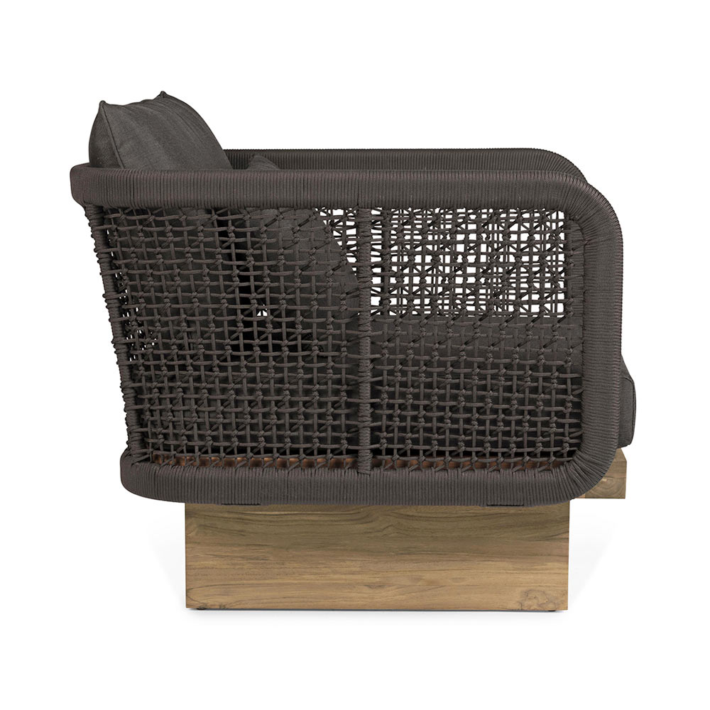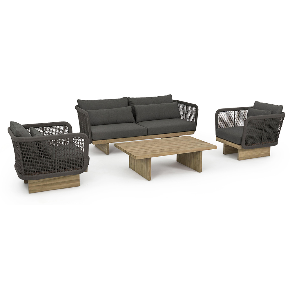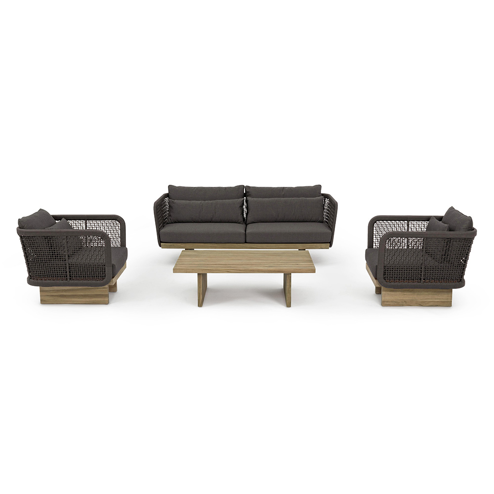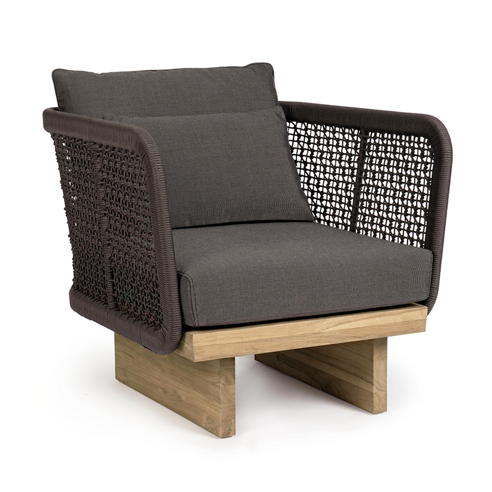 Powder coated aluminum structure (polyester). Seat and legs in teak - SVLK (certified wood from sustainable forests) with a rustic finish. Woven for outdoor use in rope (polypropylene), water repellent and UV resistant. Removable cushions with sunbrella fabric (100% acrylic), water repellent and UV resistant. Quick dry foam padding for outdoor use (anti-humidity).