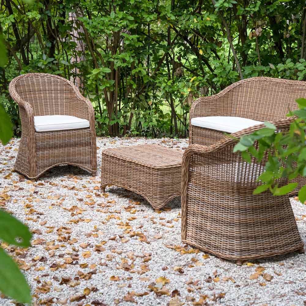 Polyrattan fibres are the highest quality available on the market (VIRO/REHAU). They are made of a special high-density polyethylene (HDPE) and are certified to resist atmospheric agents and even extreme climatic factors, without suffering significant structural damage and preserving colour fastness. Where necessary, we recommend using microfibre cloths, neutral detergents and warm water to clean these fibres.