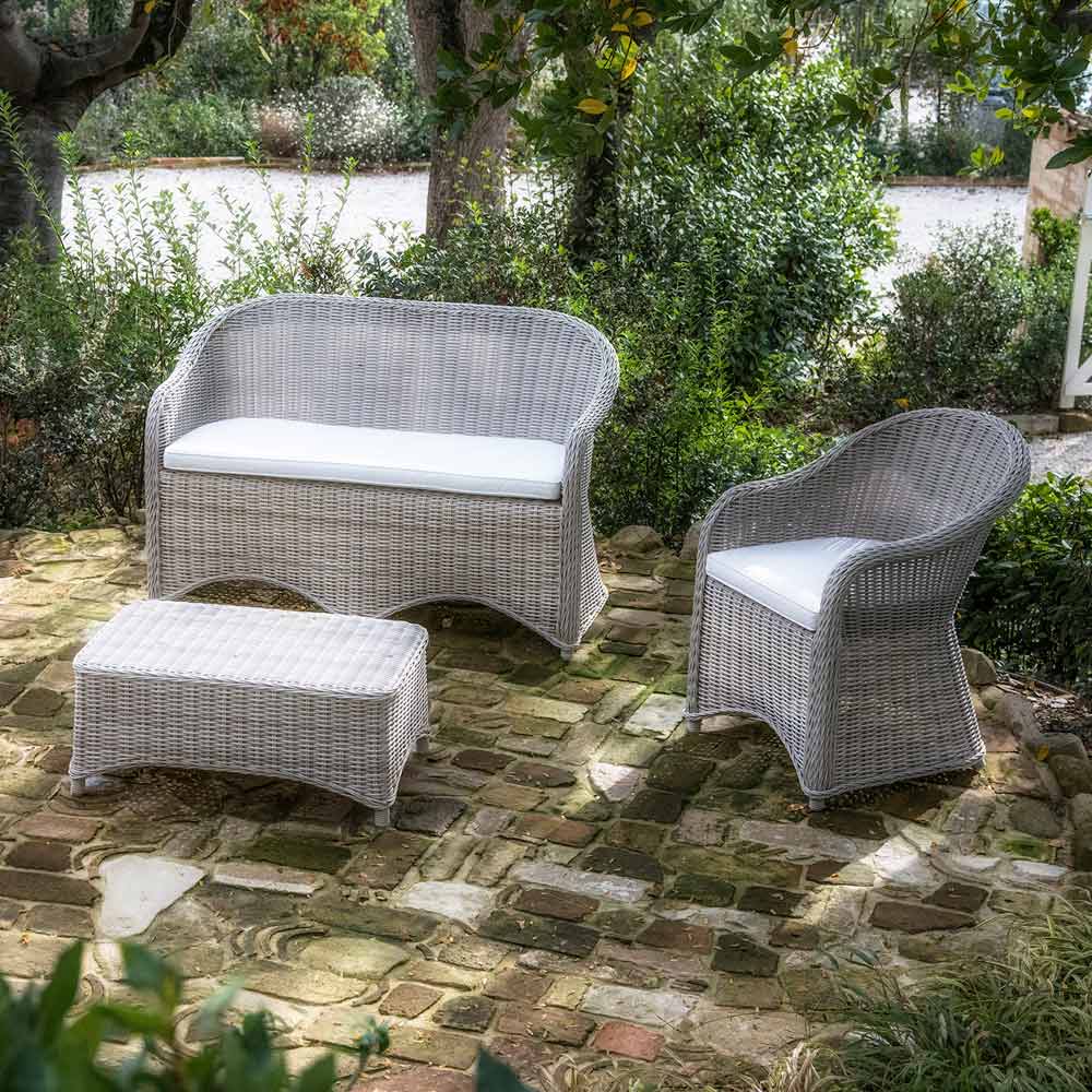aluminum frame and HQ Polyrattan weave, seat with cushion in white outdoor