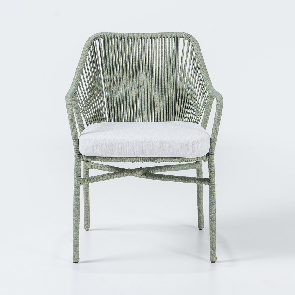 The frame colour blends harmoniously with the natural environment, while the white cushion provides a soft and inviting contrast. The armchair features a padded seat cushion for maximum comfort, allowing you to fully relax while immersing yourself in the tranquility of your outdoor space.