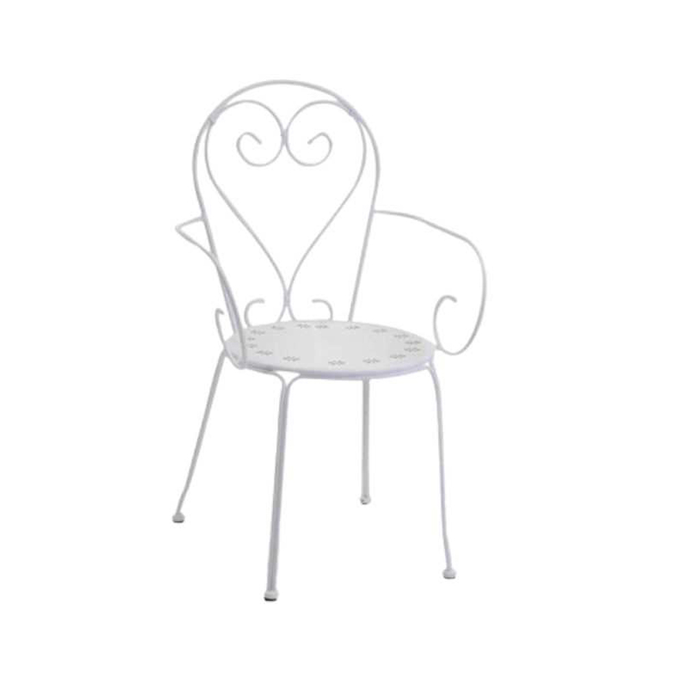 This painted metal armchair is a true design jewel, perfect for adding a touch of elegance and charm to any outdoor space. With its soft queues and romantic weaves in the backrest , this seat is not just a piece of furniture, but a true symbol of style and comfort.