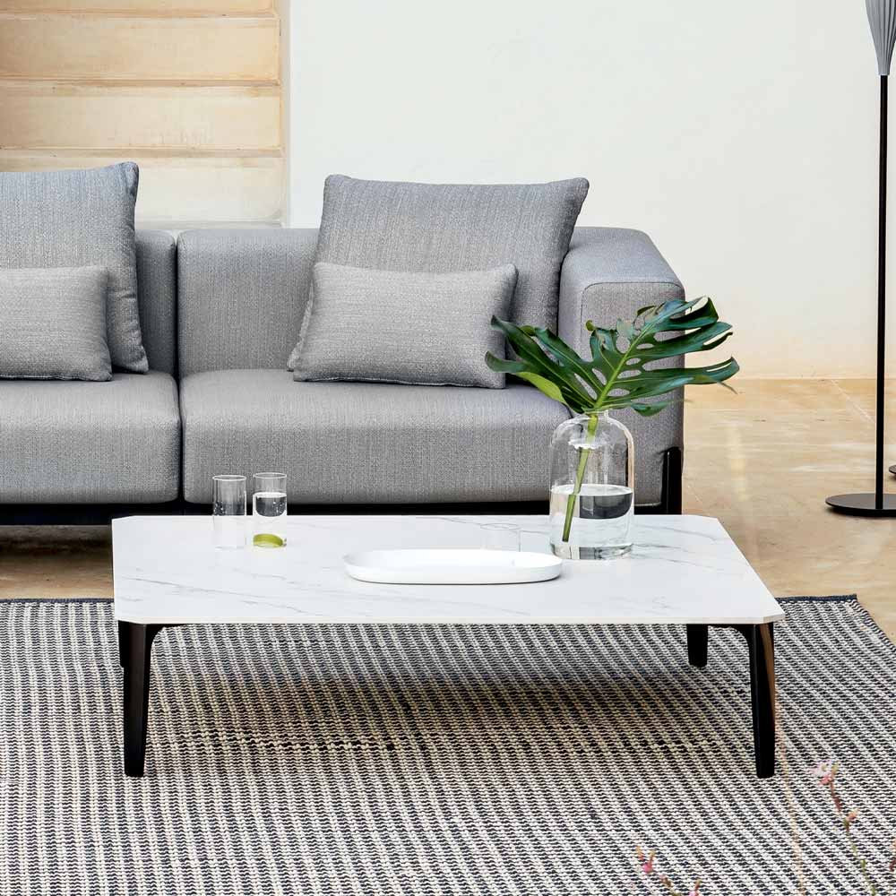 Low outdoor coffee table made of aluminium with a square top in stoneware, high quality article made in Italy.