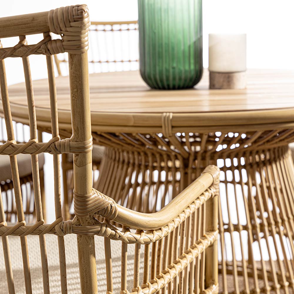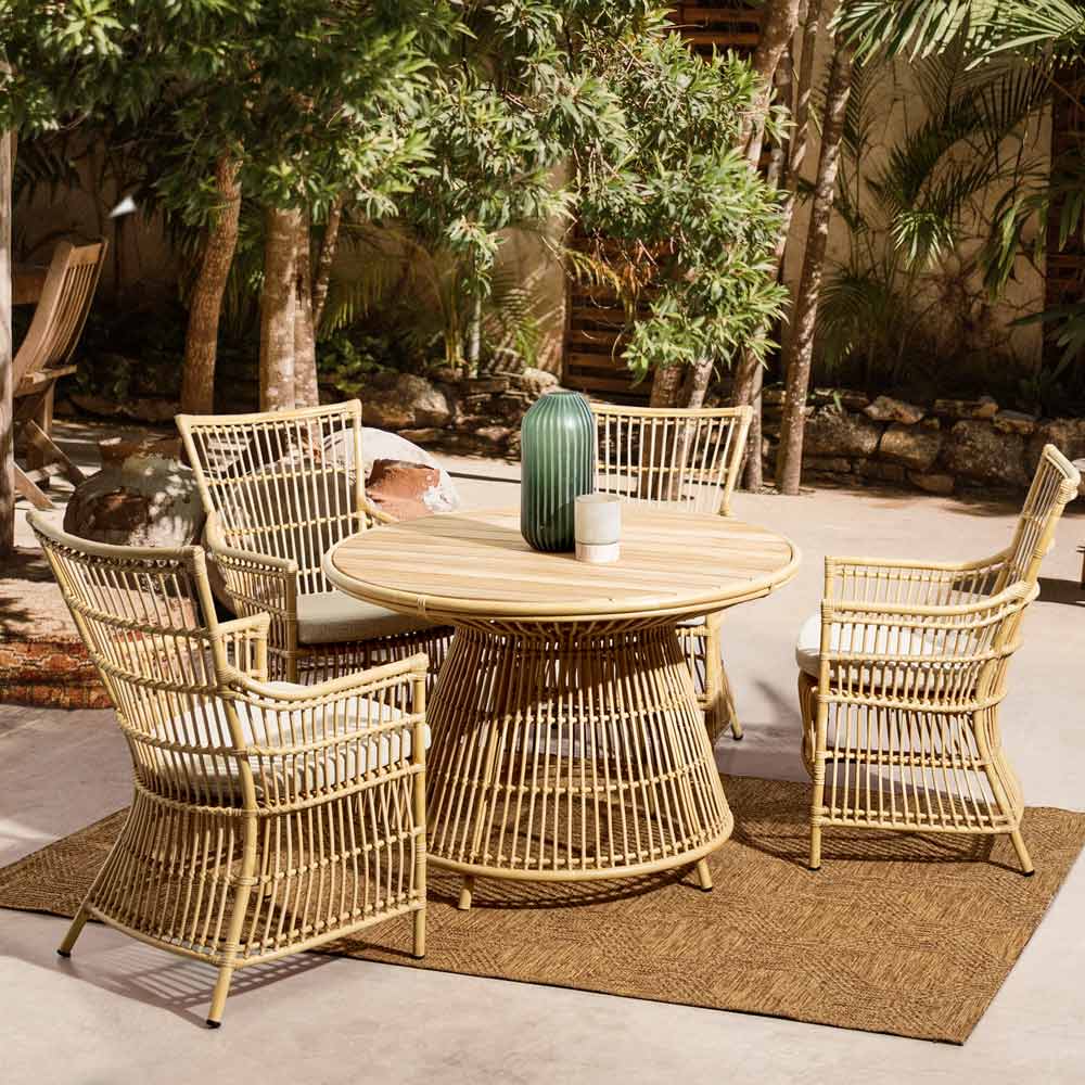This garden table is a true masterpiece of design and functionality . With its organic shape and clean queues, it is a furnishing element that stands out for its style and elegance , perfect for hosting outdoor lunches and dinners. The top of the table is made of wood, ensuring remarkable durability and easy maintenance. The rattan-effect aluminium base creates a visual effect of lightness and openness , allowing the table to integrate perfectly with the surrounding environment, be it the greenery of the garden or the terrace of a modern house. Not just a table, but a meeting point , where design and nature blend to create unforgettable moments.