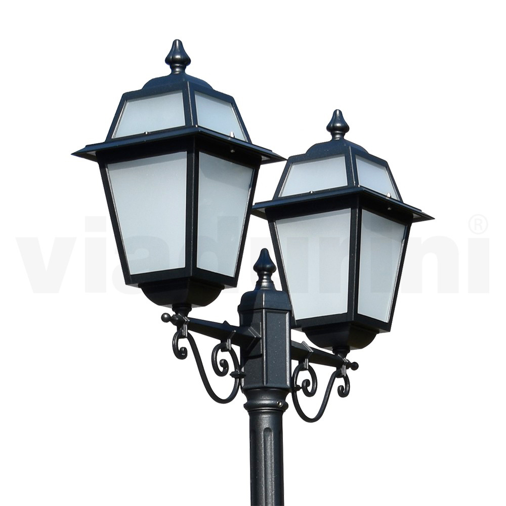 This cast aluminium street lamp with its anthracite finish is a stylish choice for any outdoor setting. With a classic and elegant design, it features crafted details that evoke an atmosphere of times gone by. The 2 lanterns, with attention to the smallest details, spread a warm and soft light, ideal for creating a luminous path in your garden or for classy delimiting an outdoor relaxation area. Solidity and beauty come together in this street lamp, designed to last over time and resist atmospheric agents. Elegant and functional , it will be the luminous signature of your outdoor space.