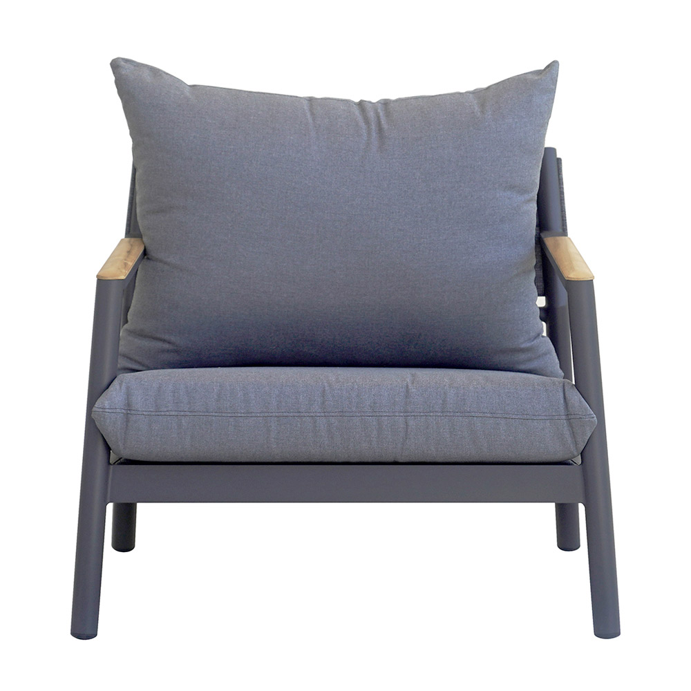 Outdoor lounge set including 2 armchairs and a three-seater sofa made with anthracite aluminum frame and teak armrests with removable grey cushions and brick and ash finish pillow. Also included is a coffee table with a slate-effect ceramic glass top and aluminium frame.