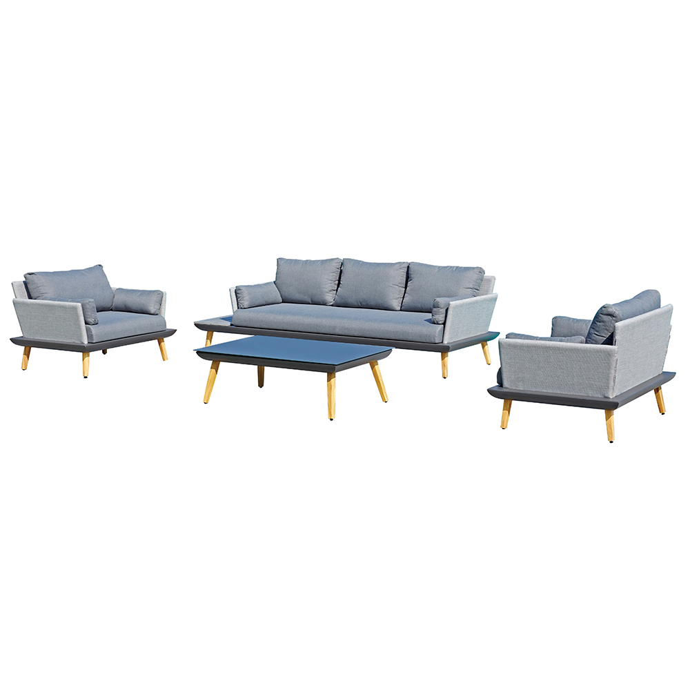 Outdoor composition with aluminium structure and tempered glass coffee table.