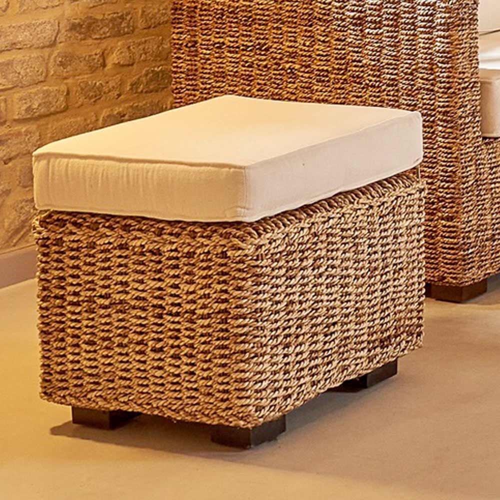 Outdoor pouf made of natural abaca fibre weave with cushion included in the standard " Ecru " finish.