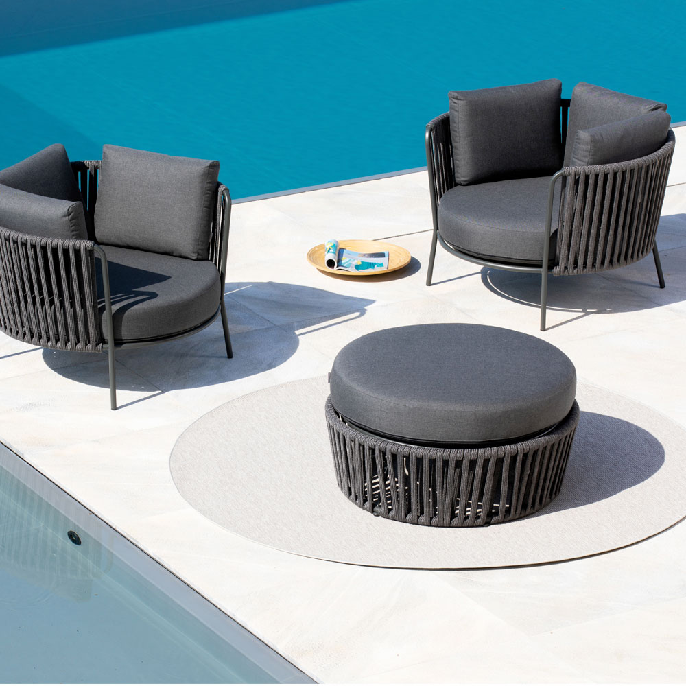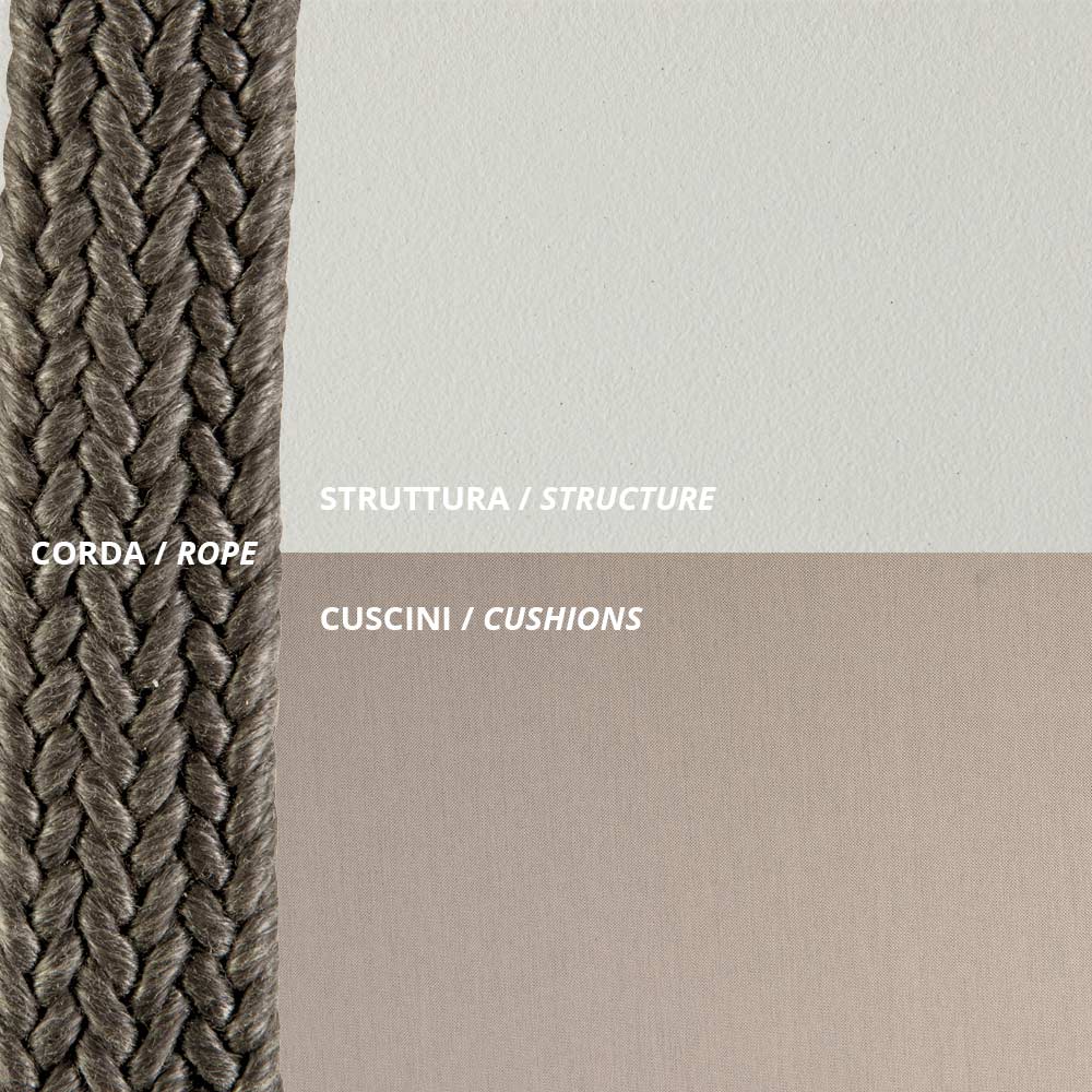 Outdoor furniture pouf in galvanized steel and rope completely made in Italy with seat cushion included . The galvanization allows a greater resistance of the material finish to corrosive atmospheric agents while the rope is resistant to chlorine and solar rays as well as anti-mould. The cushion is made of material resistant to UV rays and water that maintains the colour for a long time making the swing a perfect element to furnish any outdoor environment.