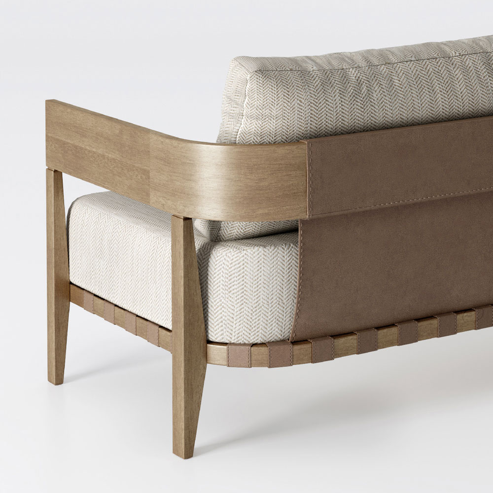 weathered teak wood structure. The sofa is embellished in the seat structure and in the backrest with