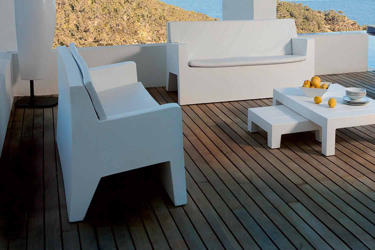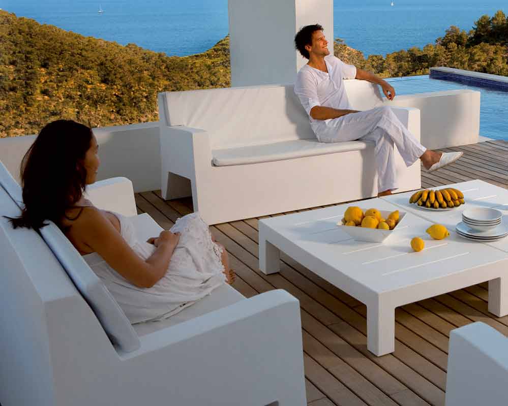 The Jut by Vondom collection is designed for both outdoor and indoor spaces. Queues with pure shapes reflectING the mineral inspiration and refinement of their technique that creates unprecedented products for outdoor furniture. Ergonomics, functionality and ecology are other key features of the Jut. The innovative and recyclable material takes care of the maximum demands of the market to guarantee a long-lasting use in support of the most extreme atmospheric conditions maintaining their colours throughout their life.