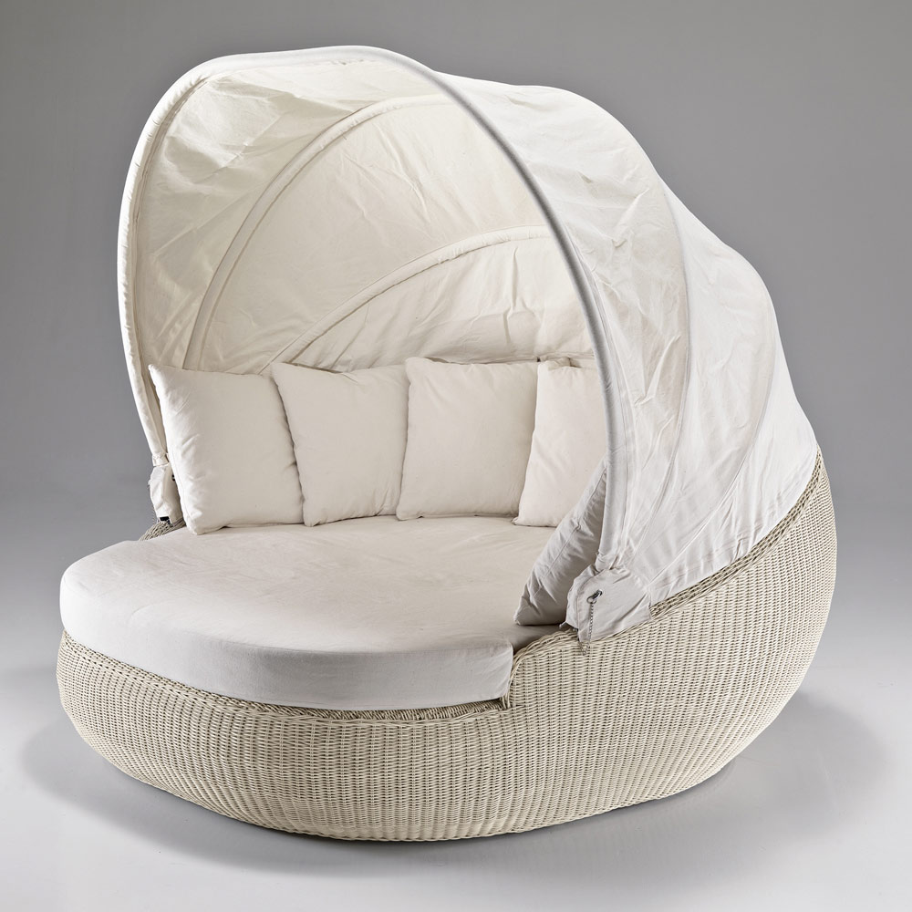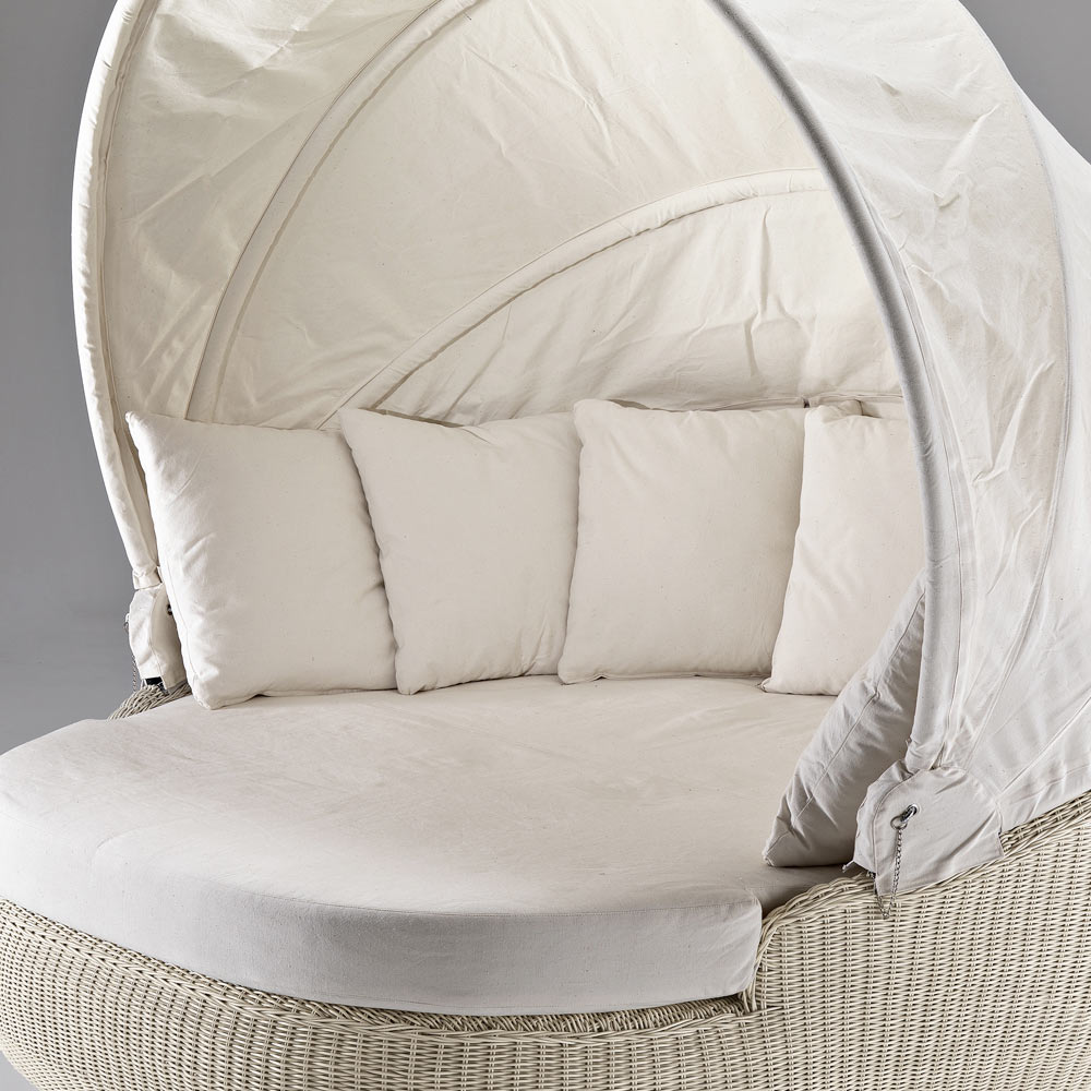This lounger is characterized by its circular design and full weave. Its rounded and sinuous volumes blend perfectly with the large seat that allows you to enjoy optimal relaxation. The opening and closing hood makes this lounger original and practical, as they allow you to enjoy both sunlight and shade in the hottest moments of the day.