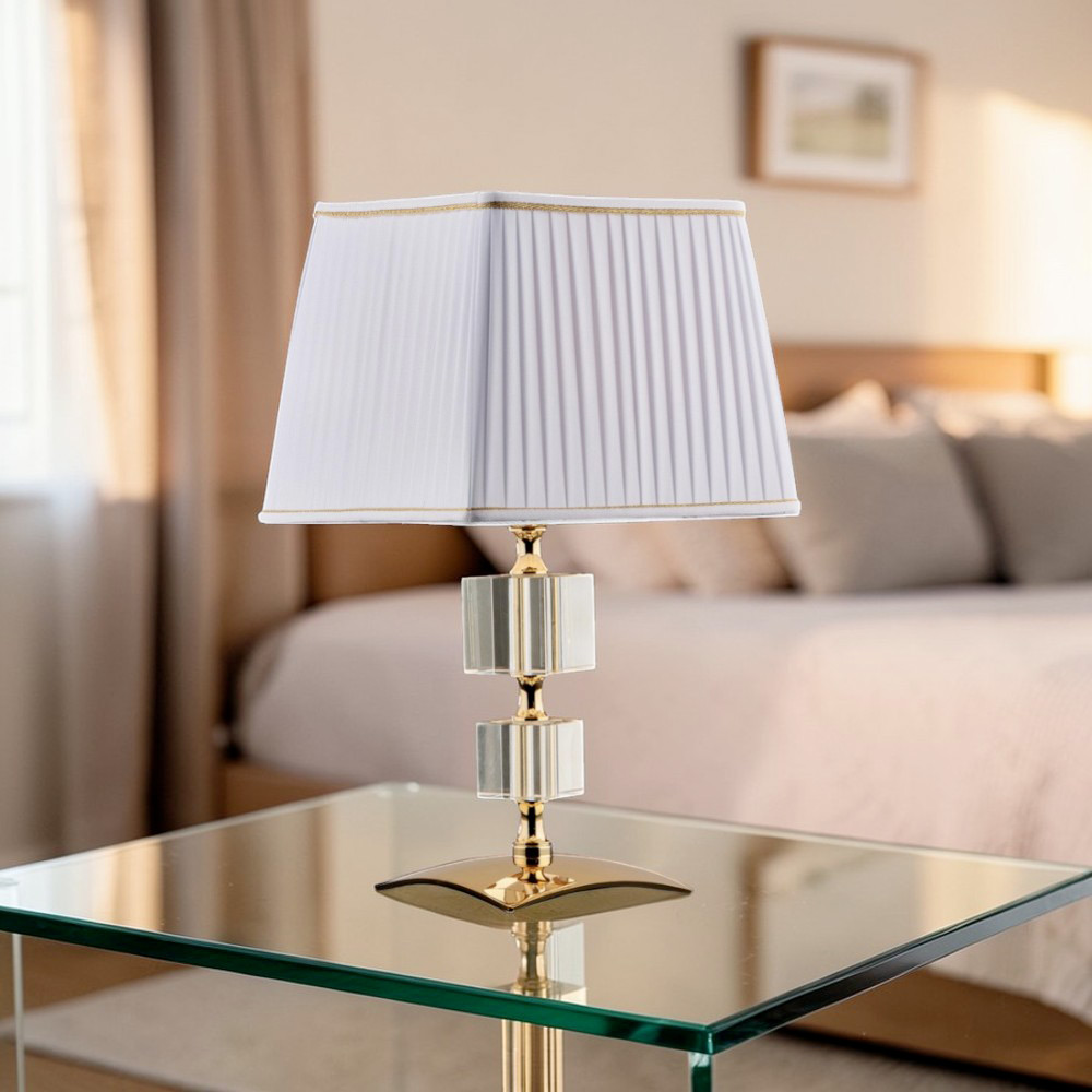 Refined and elegant, these luxury lamps in gilded iron and crystal represent a perfect balance between classic design and contemporary taste. The slender structure, embellished with geometric crystal elements , is paired with a pleated fabric lampshade that diffuses a soft, enveloping light, creating a warm and sophisticated atmosphere.