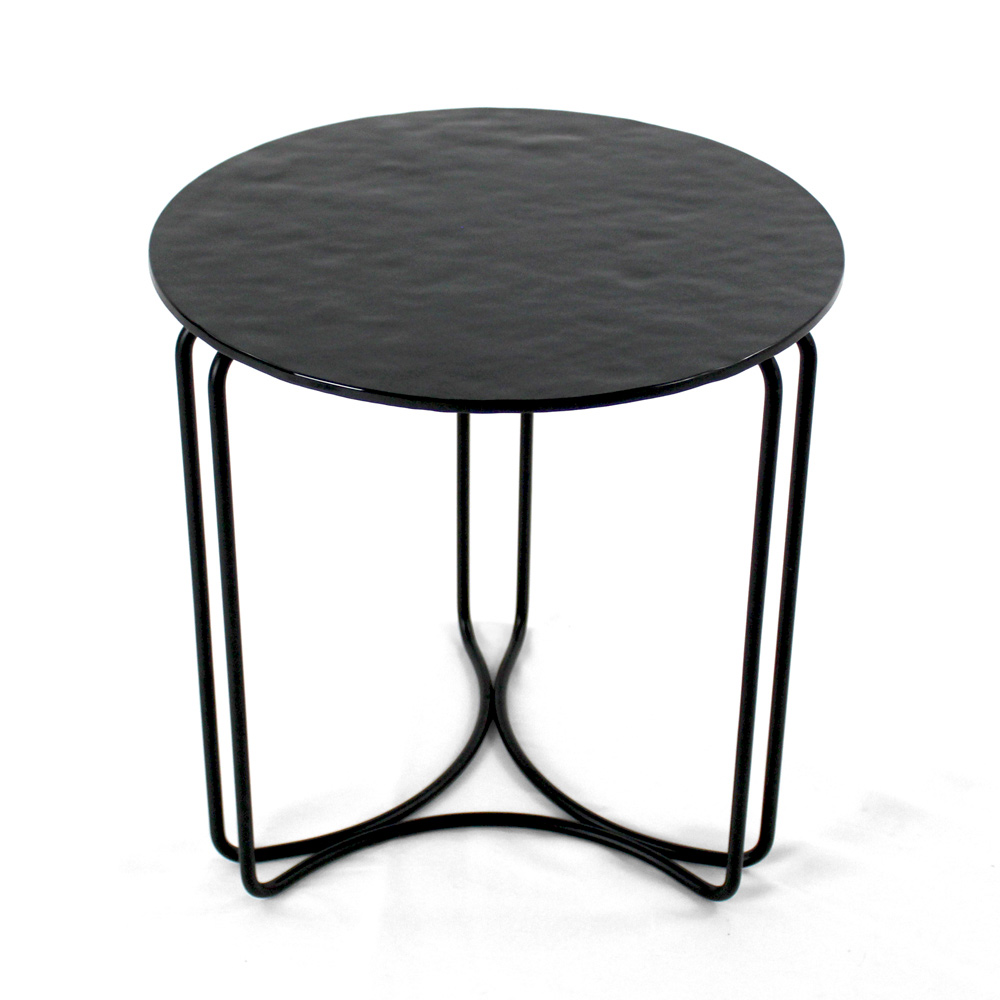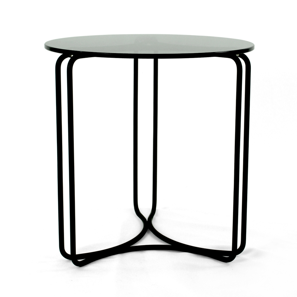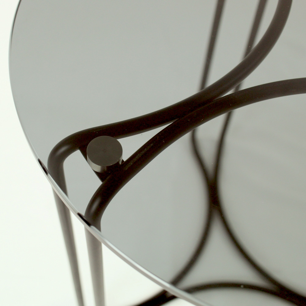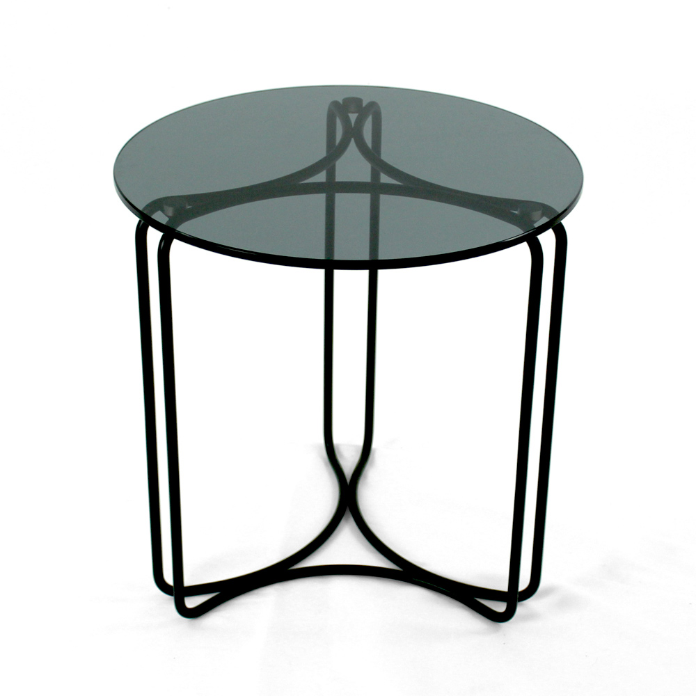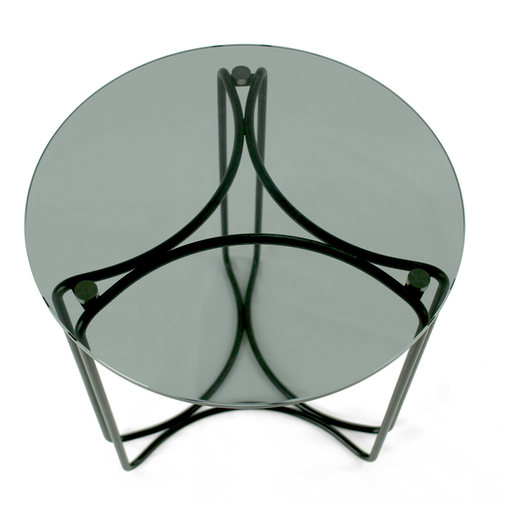 Round coffee table with painted steel base and glass top.