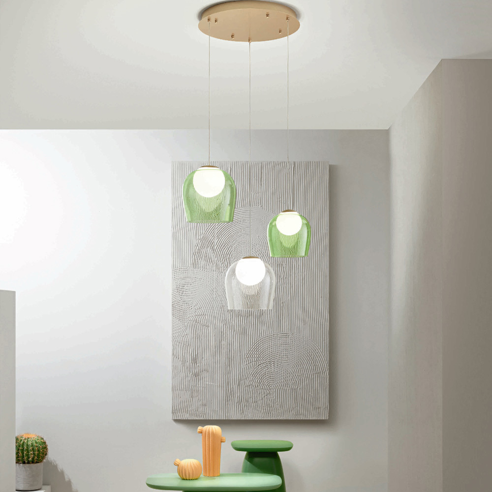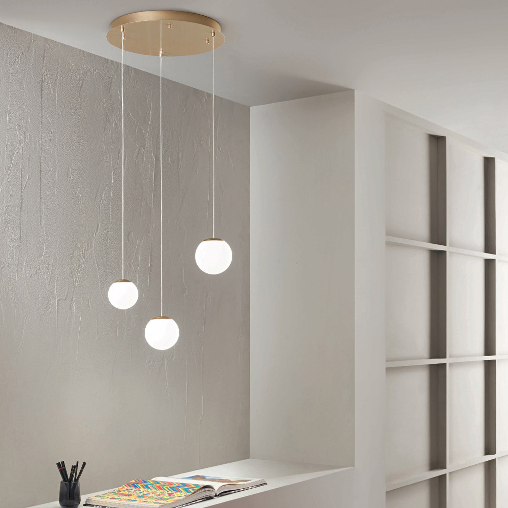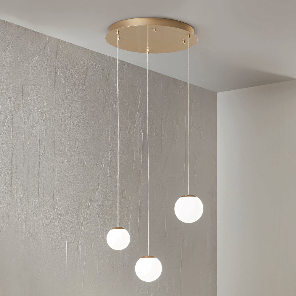 Chandelier entirely produced in Italy made of gold finish painted metal and 3 LED lights with optional colored glass lampshade removable by unscrewing the glass sphere.