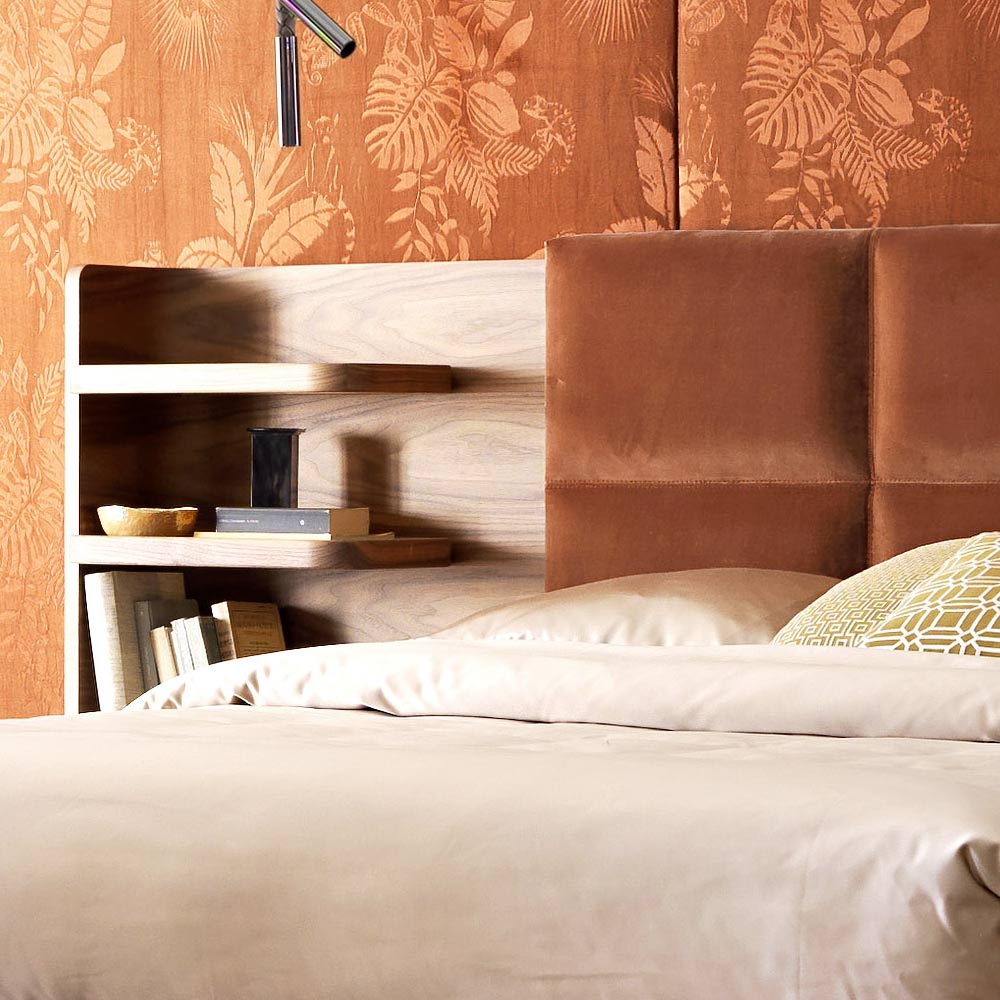York presents a curved plywood structure veneered in canaletto walnut, the bed frame and the shelves are in solid canaletto walnut.