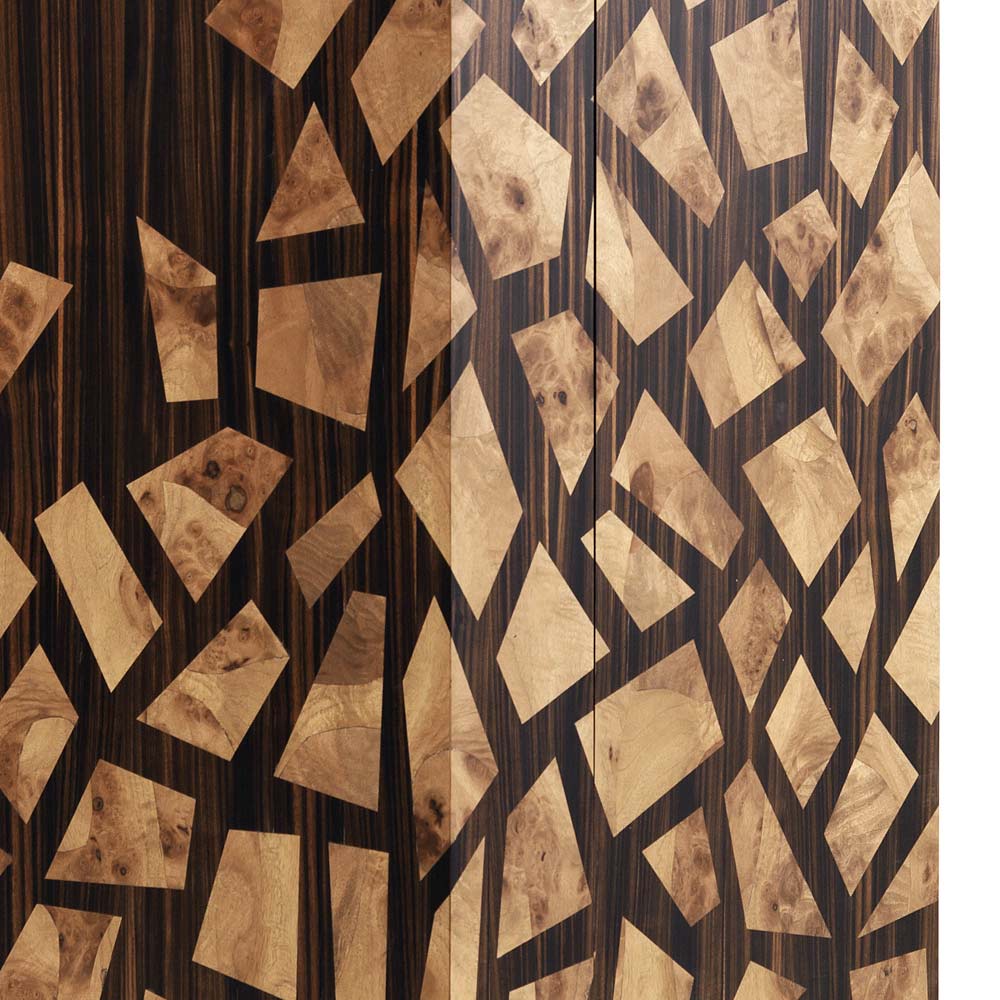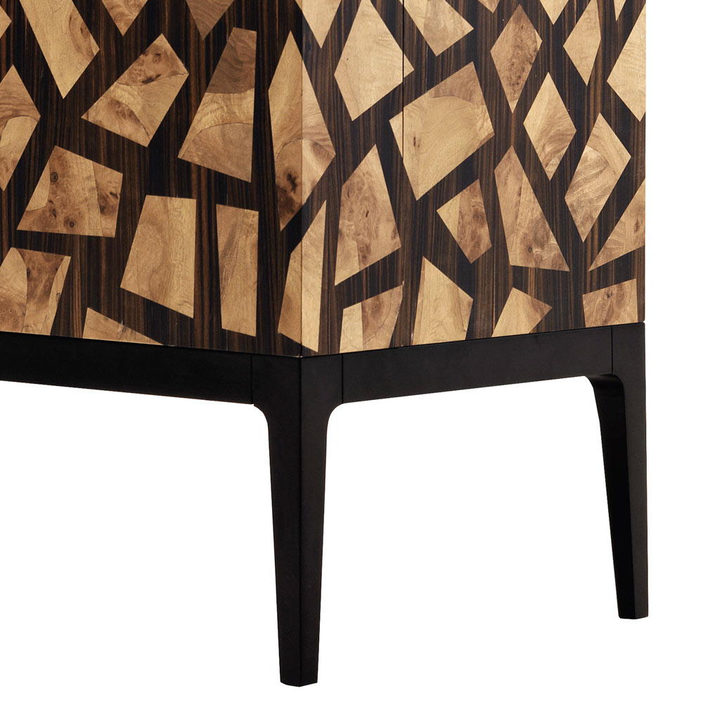 The two-door Zarafa cabinet bar is characterized by an elegant and refined style thanks to its geometric queues that recall the mantle of a famous giraffe given to the King of France in the 19th century.