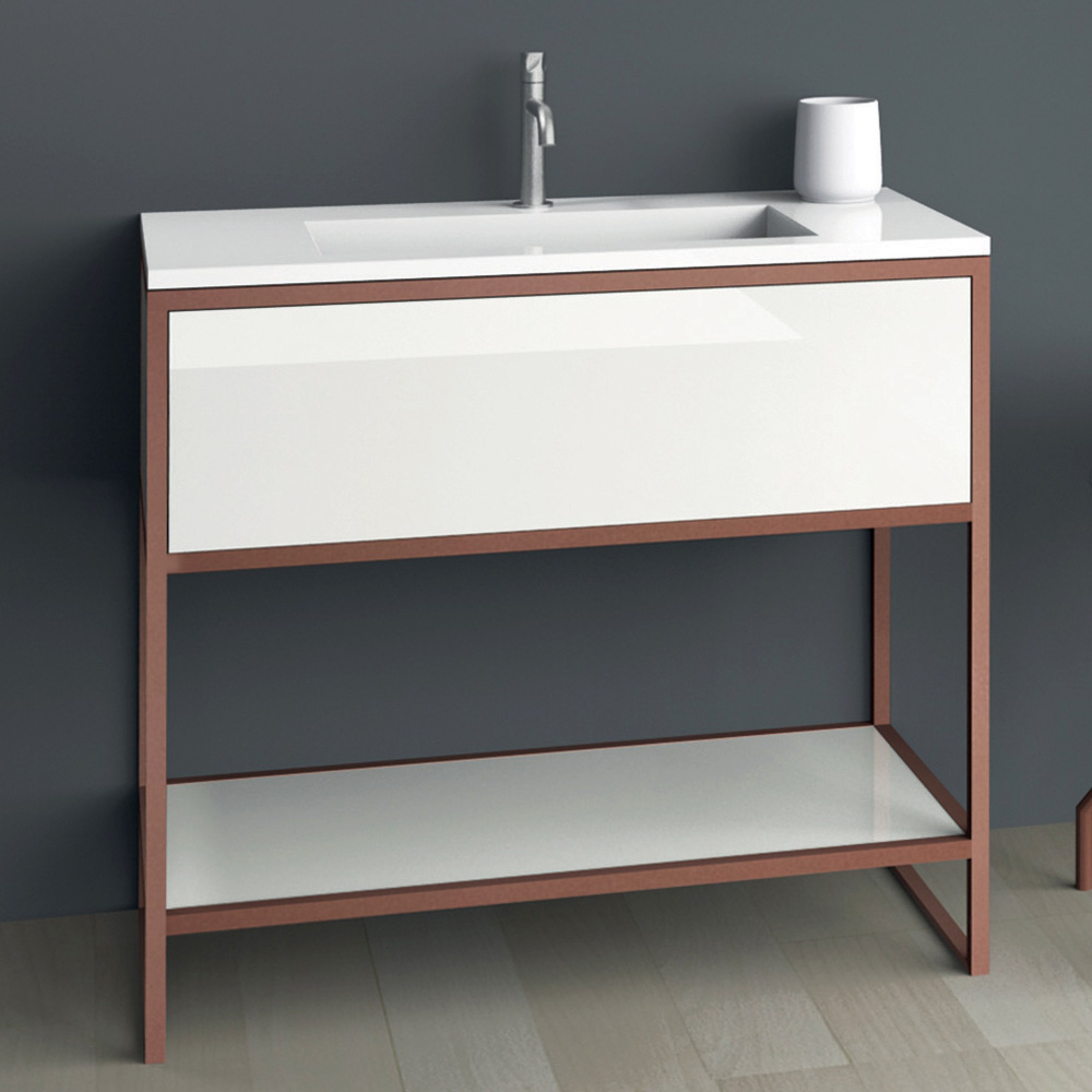 bathroom furniture is characterized by a structure made with a thin satin copper painted metal profile that frames the doors and the shelf in glossy white lacquered mdf, creating a harmonious combination of full and empty spaces. The metal finishes of the doors highlight the