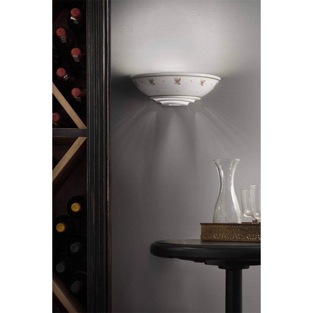 This crescent-shaped 2-light wall light is entirely made of ceramic with hand-painted floral decoration motifs, Ā to highlight the skill and manual skills of the artisans.