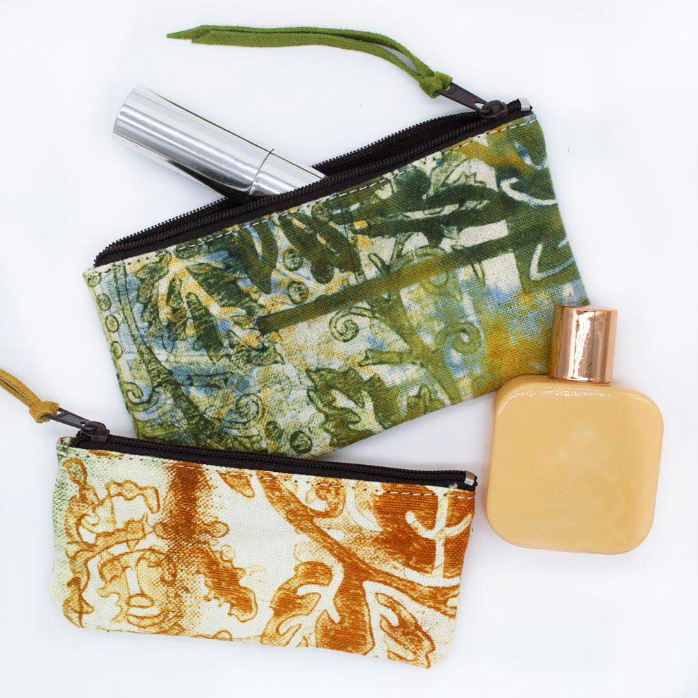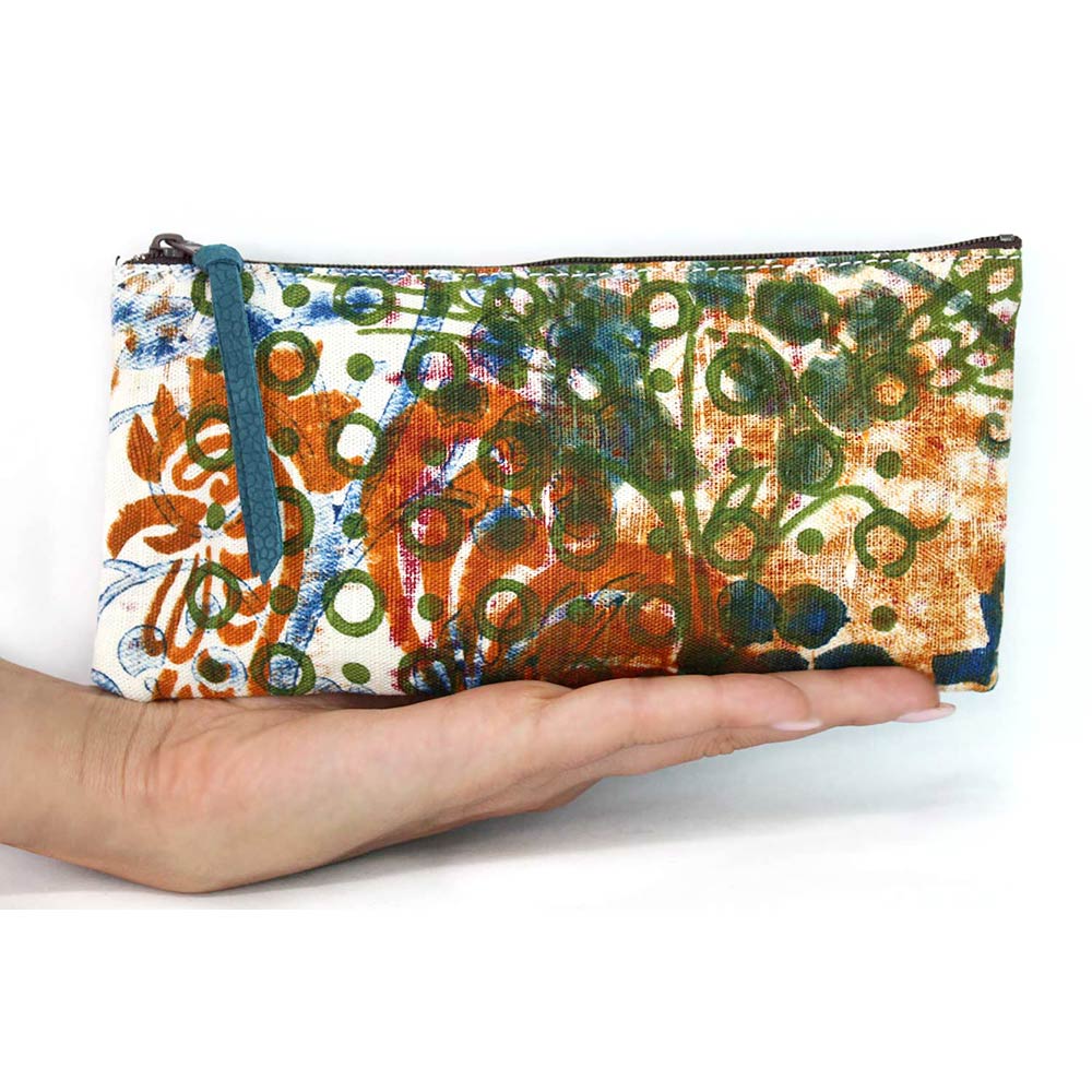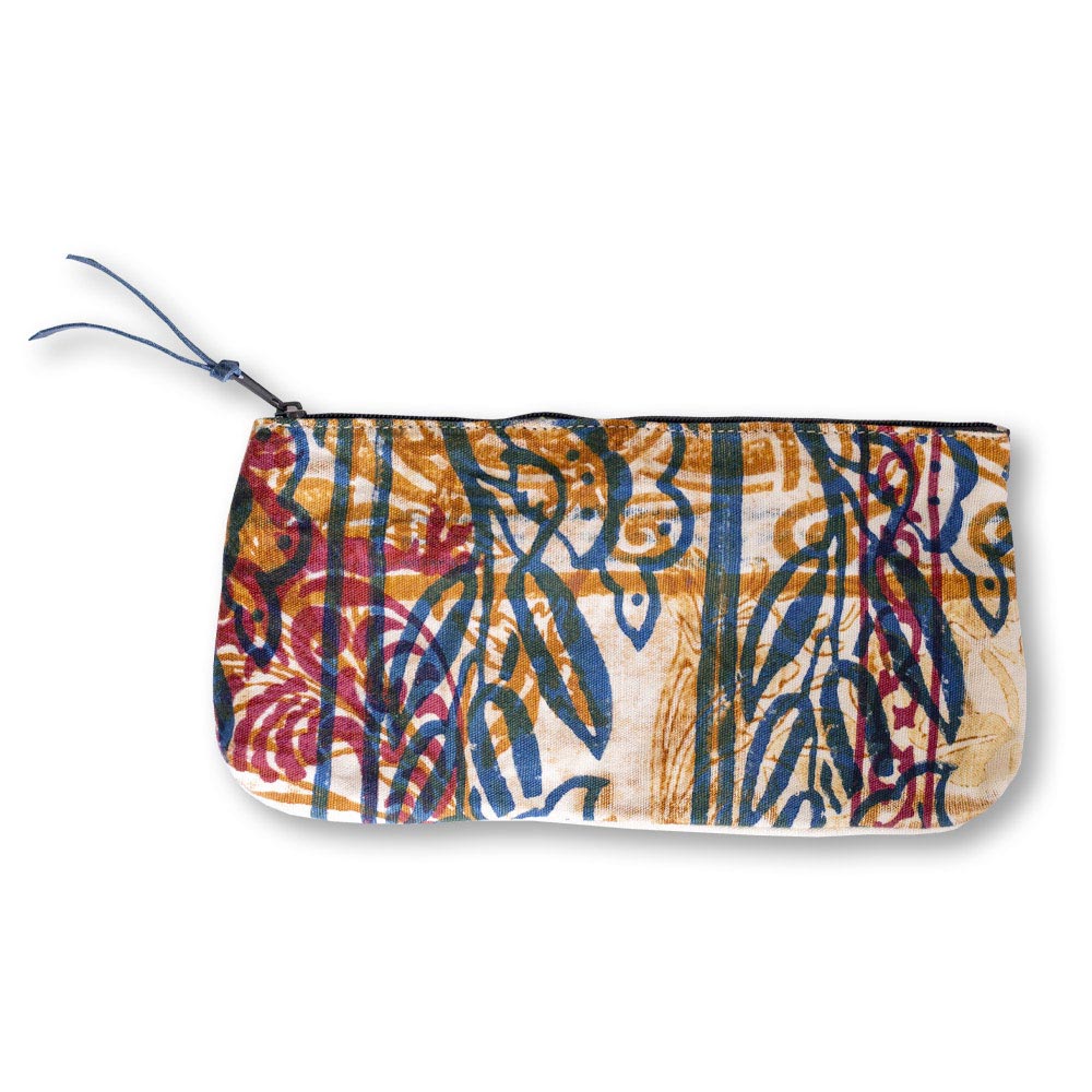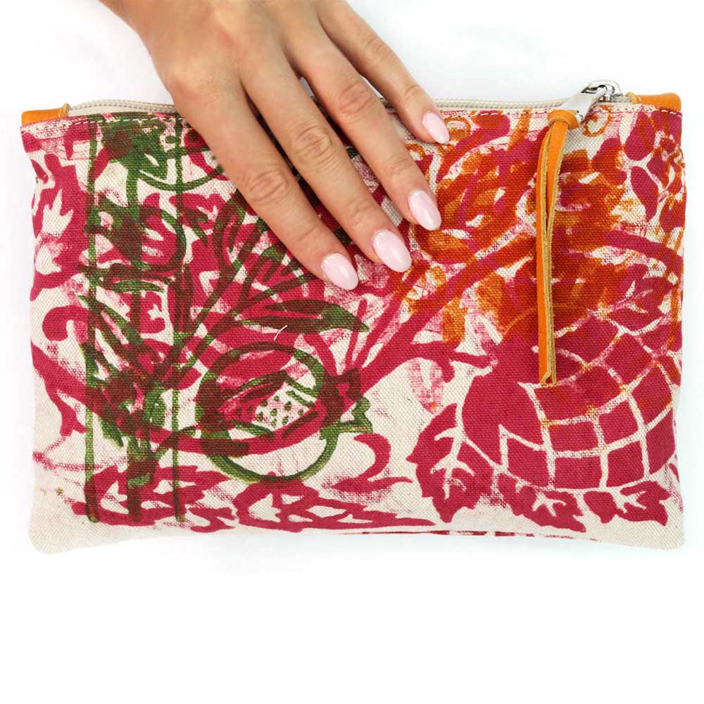 Multi-purpose rectangular single-piece clutch bag in pure cotton with colored motifs printed by hand, made in Italy.