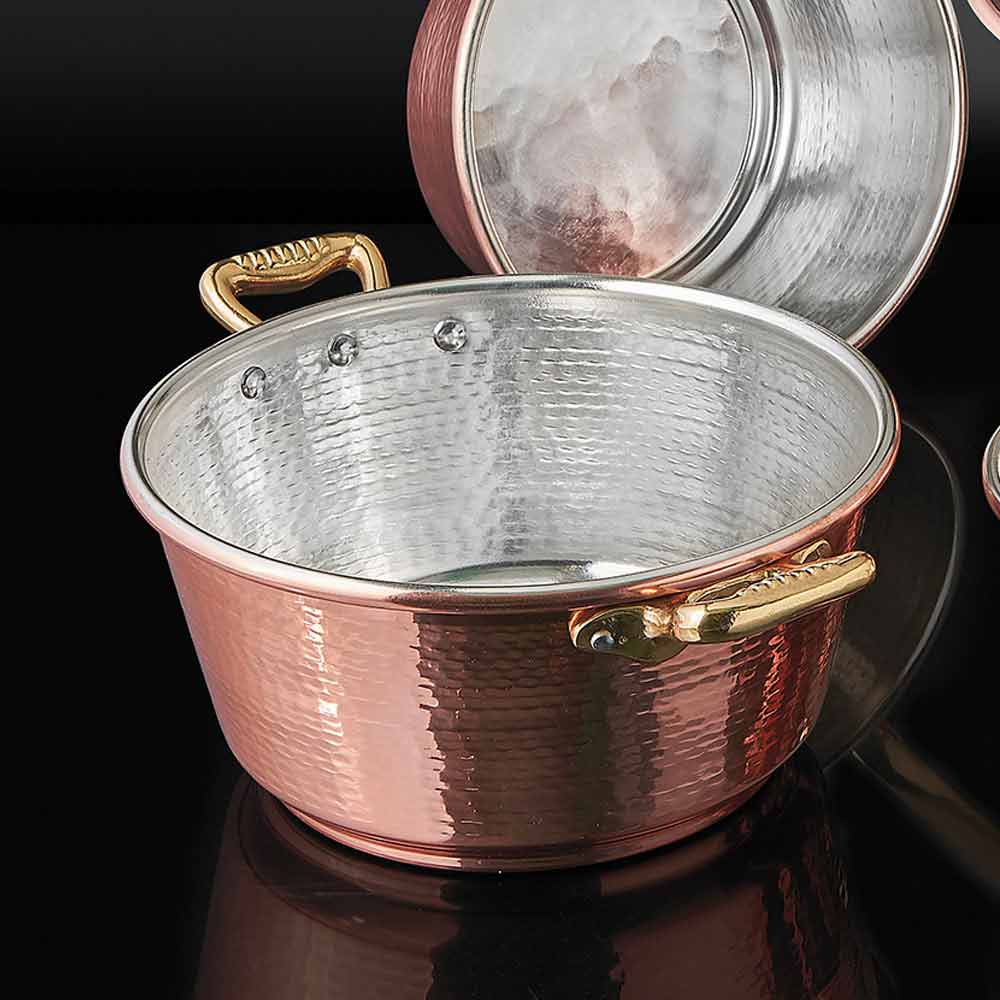 hand-hammered copper features a conical and elegant shape with solid brass handles.