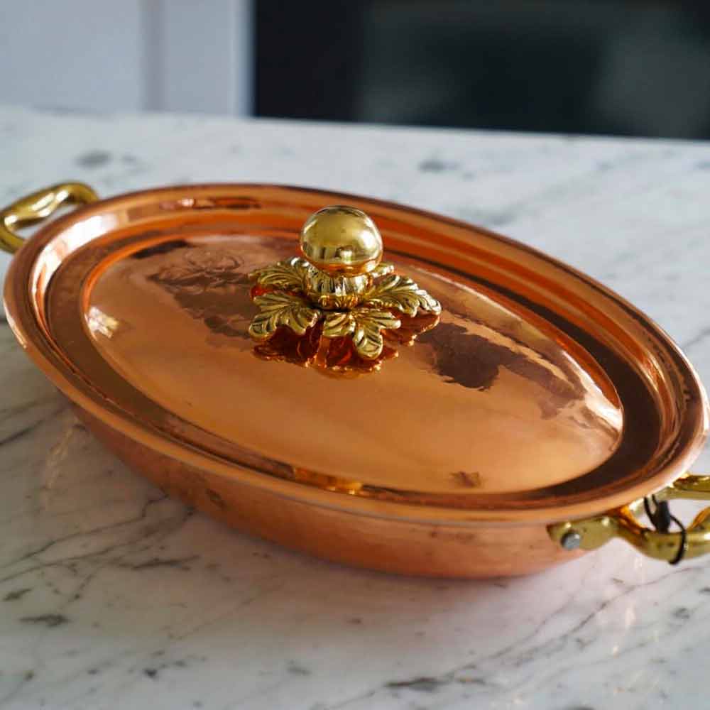 Oval saucepan with lid, hand-tinned copper work with brass handles made in Italy.