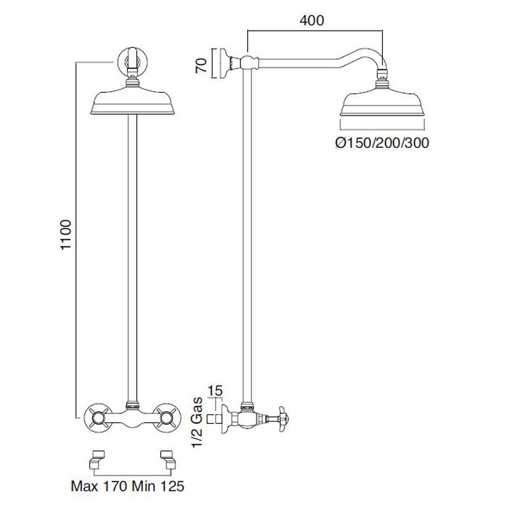 wall-mounted shower set with a shower rod, arm and shower head is entirely