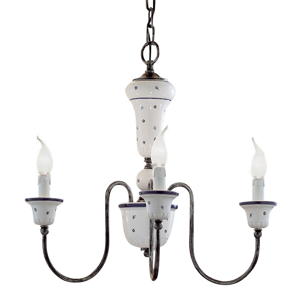 Artisanal 3-light chandelier in brass and hand-painted ceramic made in Italy by Ferroluce.