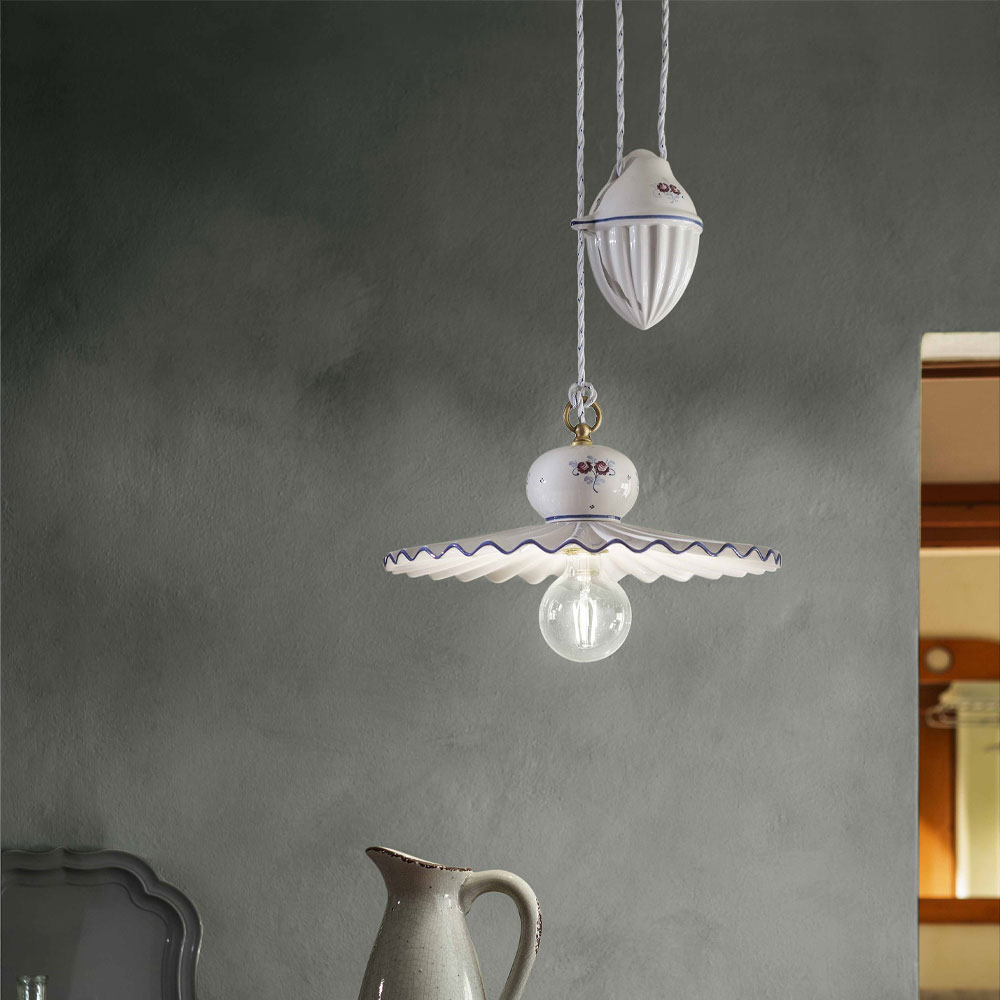 Handcrafted suspended sliding lamp in metal and hand-painted ceramic made in Italy by Ferroluce.