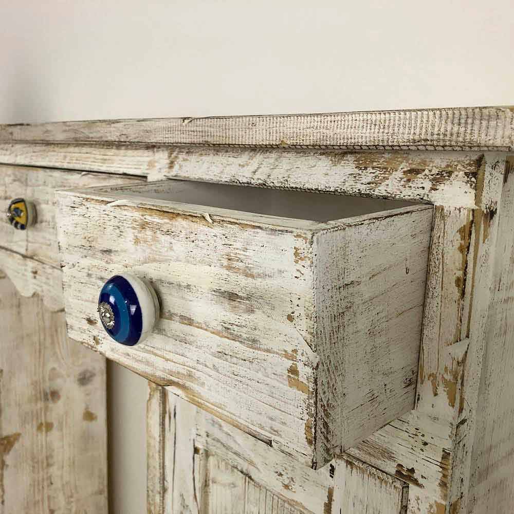 Console in solid fir wood entirely handmade in Italy and characterized by the wonderful flame-burned and whitewashed flayed finish. Its structure includes 2 doors with internal shelf and 3 drawers which are completed with special hand-painted ceramic knobs allowing you to have perfectly organized spaces.