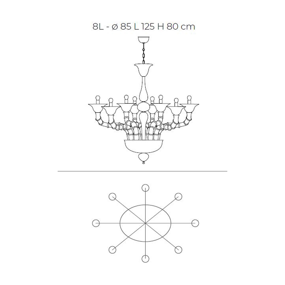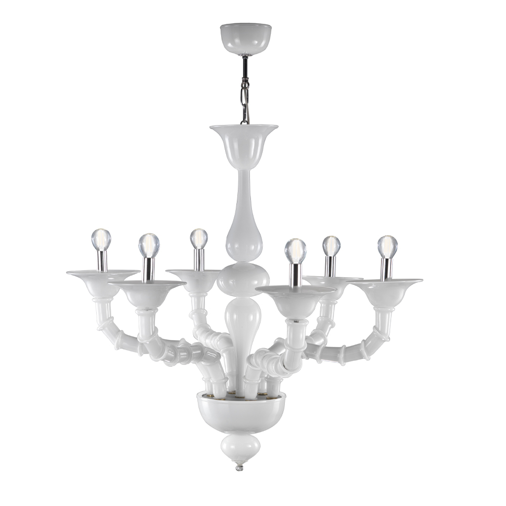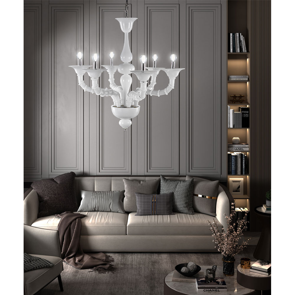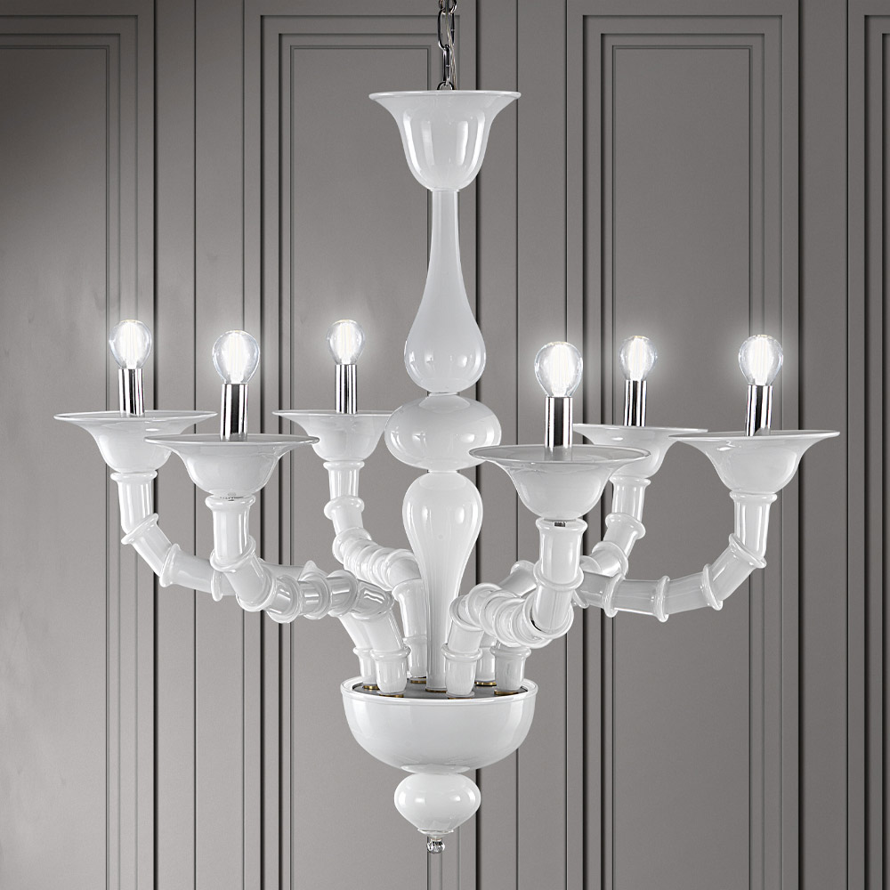 of hand-blown white Rezzonico glass designed to complete large areas of the house such as dining rooms or lounges, giving life to high-quality lighting with an intriguing personality. The length of the arms is made possible thanks to the particular technique defined as "bossole" which consists in fitting several glass parts together giving proof of