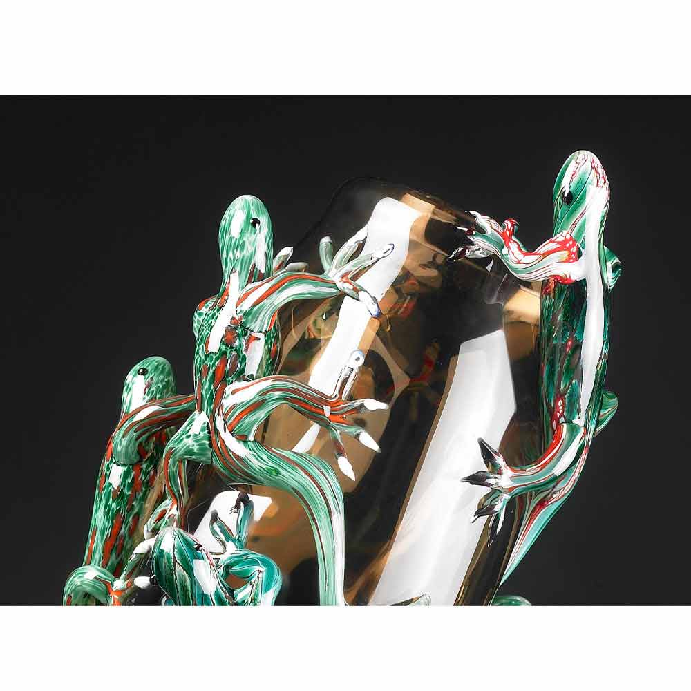 Indoor vase handcrafted in Italy in brown glass handmade by master glassmakers who have been experts in the sector for generations enriched by 8 geckos in shades of red, blue and green. Its peculiarity is represented by the artisanal production which increases its value and value to give life to an exclusive and high quality result . An eccentric decorative element for your spaces capable of giving an original touch thanks to its strong creative personality . The result is a simple object for the home capable of enriching the style of any home with originality thanks to its modern soul and avant-garde design .