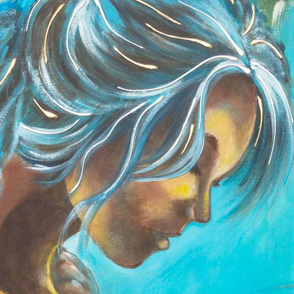 Cotton canvas with embossed resin details. The painting depicts the figure of a beautiful young woman; her precious hair is decorated with silver and gold leaf.