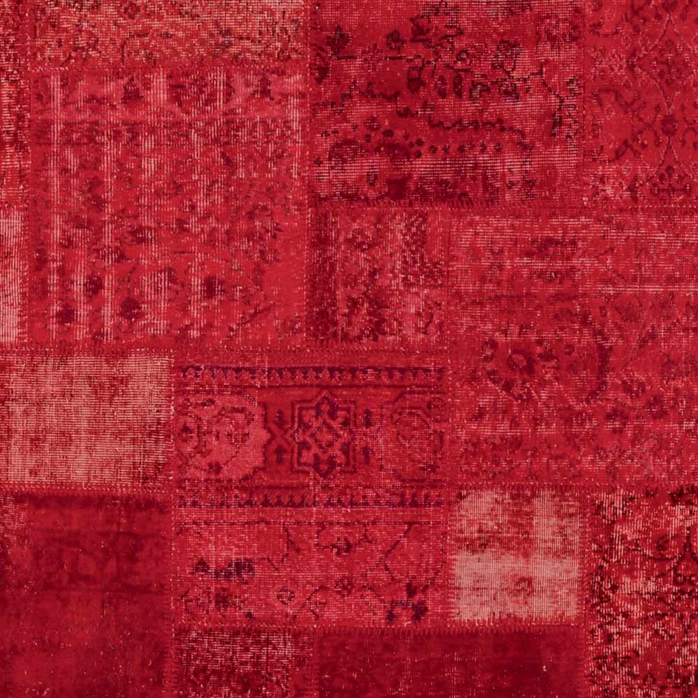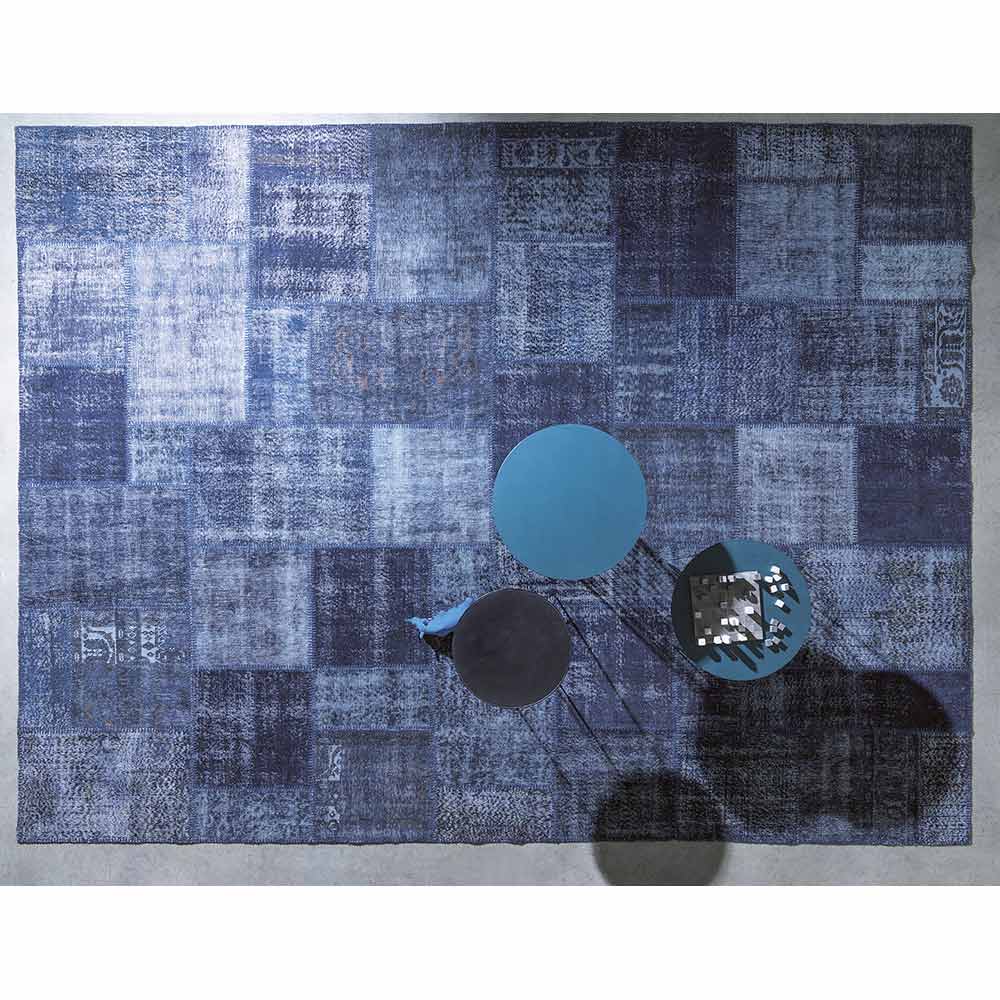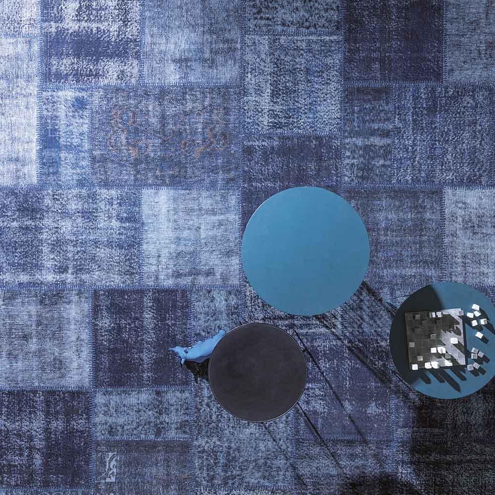 The peculiarity of this carpet is given by the patchwork process for which ancient Anatolian rugs are first bleached and dyed, then cut into squares of different shapes and colours and then sewn together by hand.