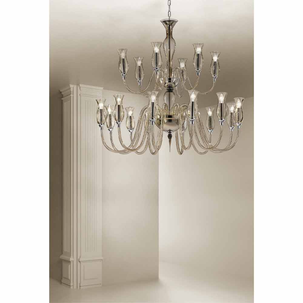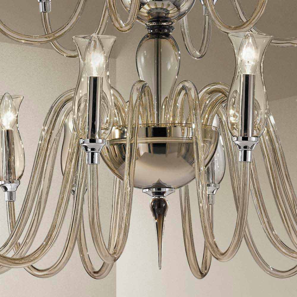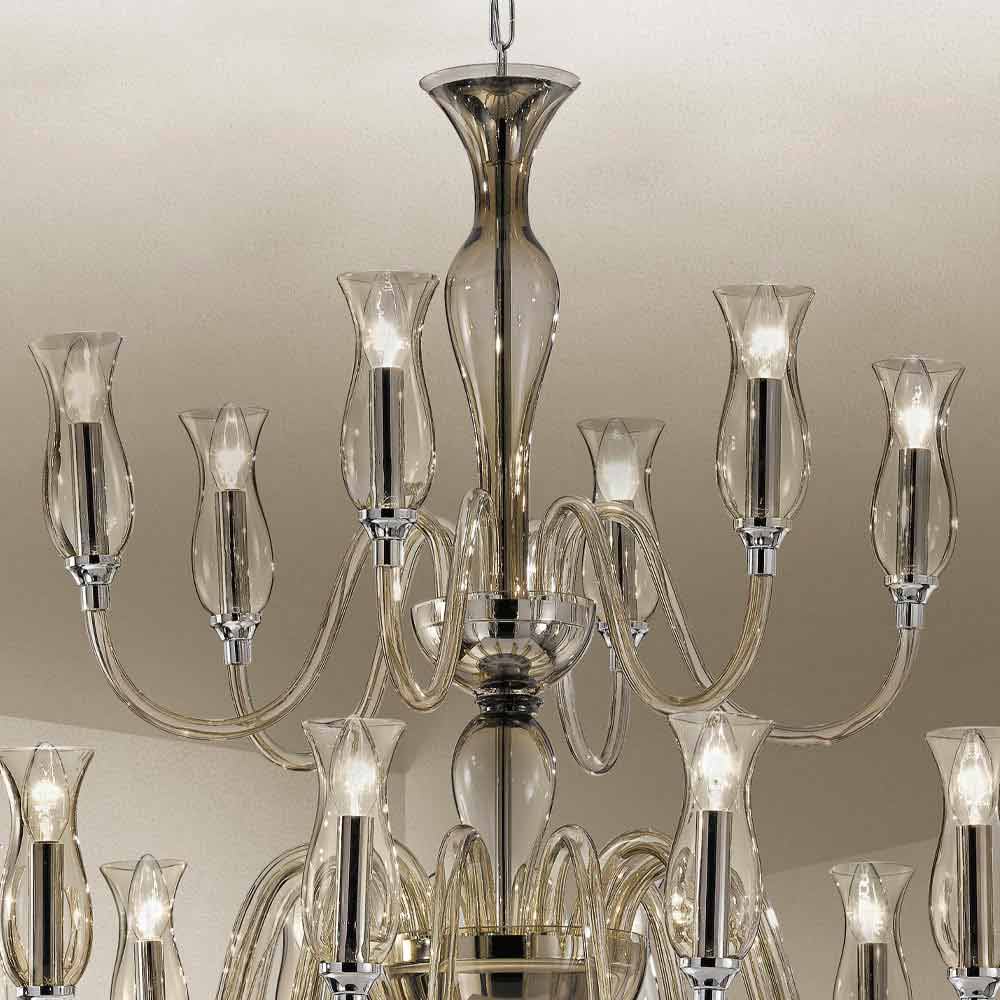 Fine and delicate 18-light chandelier handcrafted in Venice glass in smoked finish with polished chromed metal details, Made in Italy . From the reinterpretation of the classic and noble forms of glass , a new beauty formula is born, characterized by sinuous and essential lines which, redefining traditional shapes, give life to a furnishing solution capable of completing any environment with personality. What enriches the aesthetics is the smooth surface of the glass that allows the light to slide in different directions for plays of transparencies that combine with the vibrant light effects for an exclusive result with a strong visual impact .