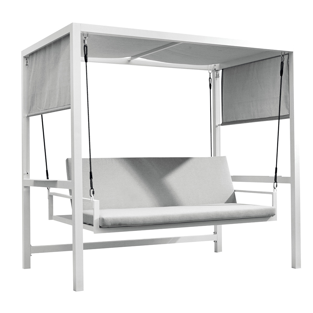 Garden swing made of white painted aluminum with 190 gr olefin fabric cushions in light grey colour. This outdoor swing is equipped with a reclining backrest which makes it ideal for creating a relaxing atmosphere and enjoying your free time outdoors. The outdoor swing features rigid and resistant structures and pure and simple lines which make it refined and ideal for rest and relaxation in any outdoor environment. The use of aluminium for the structure enhances the solidity and functionality of this product, resistant to impact and climate change.