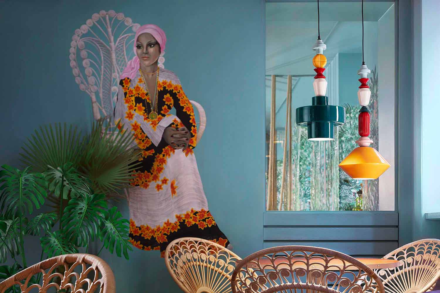 Lariat is embellished with multicolor ceramic elements that follow one another vertically up to the central geometric diffuser.