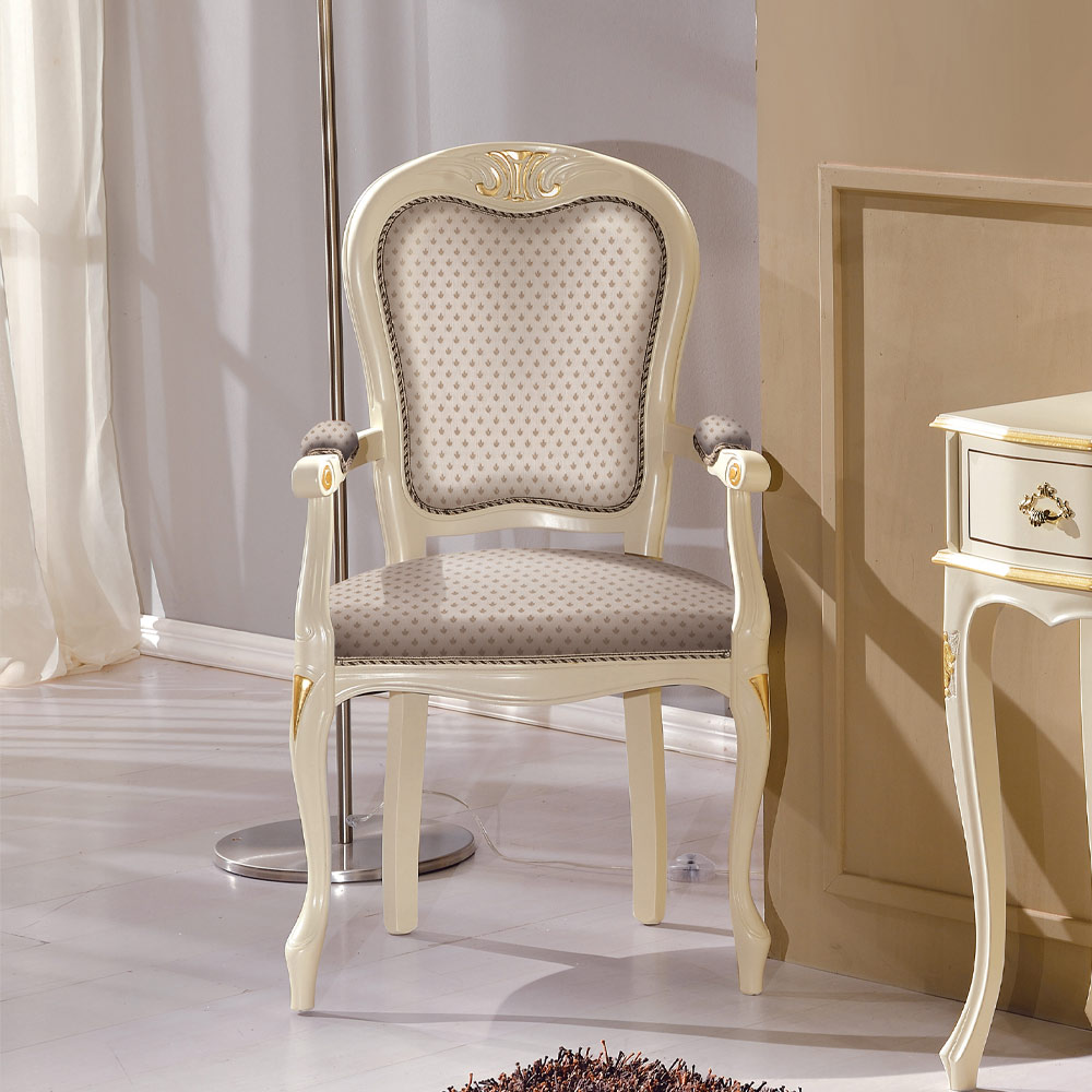 Classic style head of the table chair made of precious wood in white finish with padded seat covered in fabric complete with practical and comfortable armrests. All the style and craftsmanship that characterise the workmanship emerge in this sumptuous furniture thus making it a refined complement capable of embellishing the environment in which it is placed. Completely made in Italy and handcrafted by skilled master craftsmen , finished with wisdom and taste for elegance. The production is carried out using fine materials , and performing the work by hand with the utmost care and professionalism that distinguishes Made in Italy products.