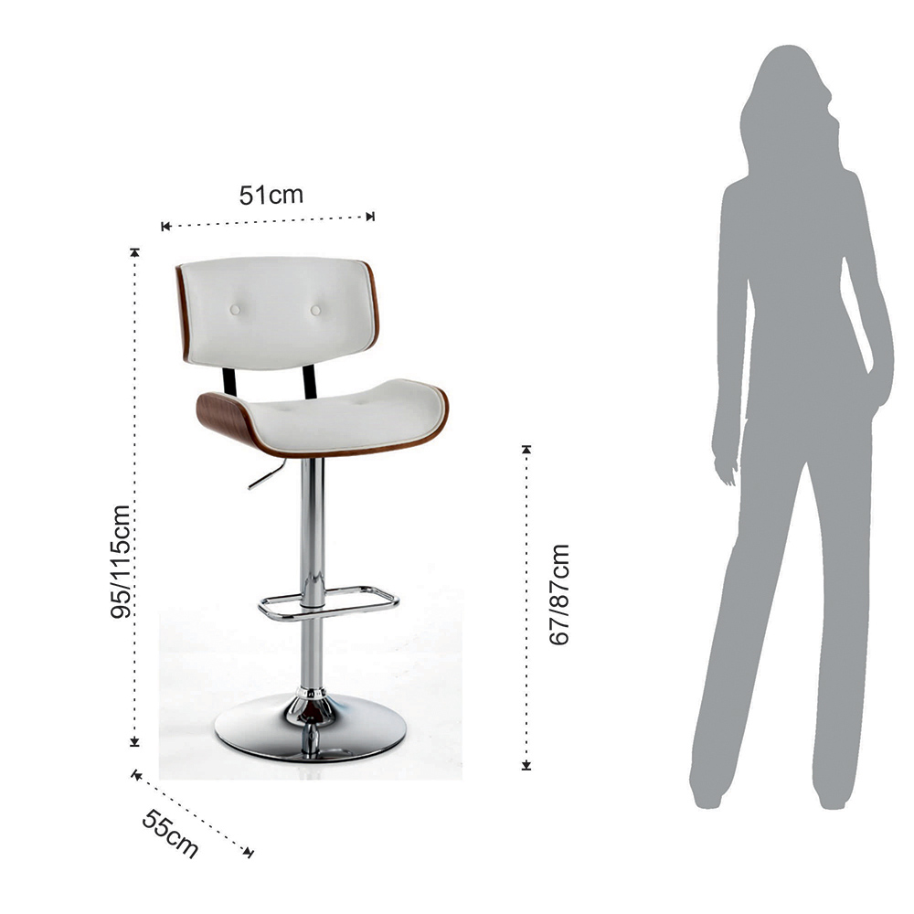High kitchen stool with base made of chromed metal complete with practical footrest and seat and back in stained plywood, walnut finish and white synthetic leather . Its peculiarity is represented by the practical adjustable petrol lift which allows you to customize the seat height up to a maximum of 87 cm. Its design is unique and captivating and is marked by soft shapes and rounded lines which ensure a comfortable and welcoming stool , therefore ideal for completing domestic environments such as kitchens or dining rooms but also bars and restaurants with a modern style. The wonderful combination between the imposing touch of wood and the timeless elegance of leather gives life to an original , avant-garde complement with a strong contemporary personality .