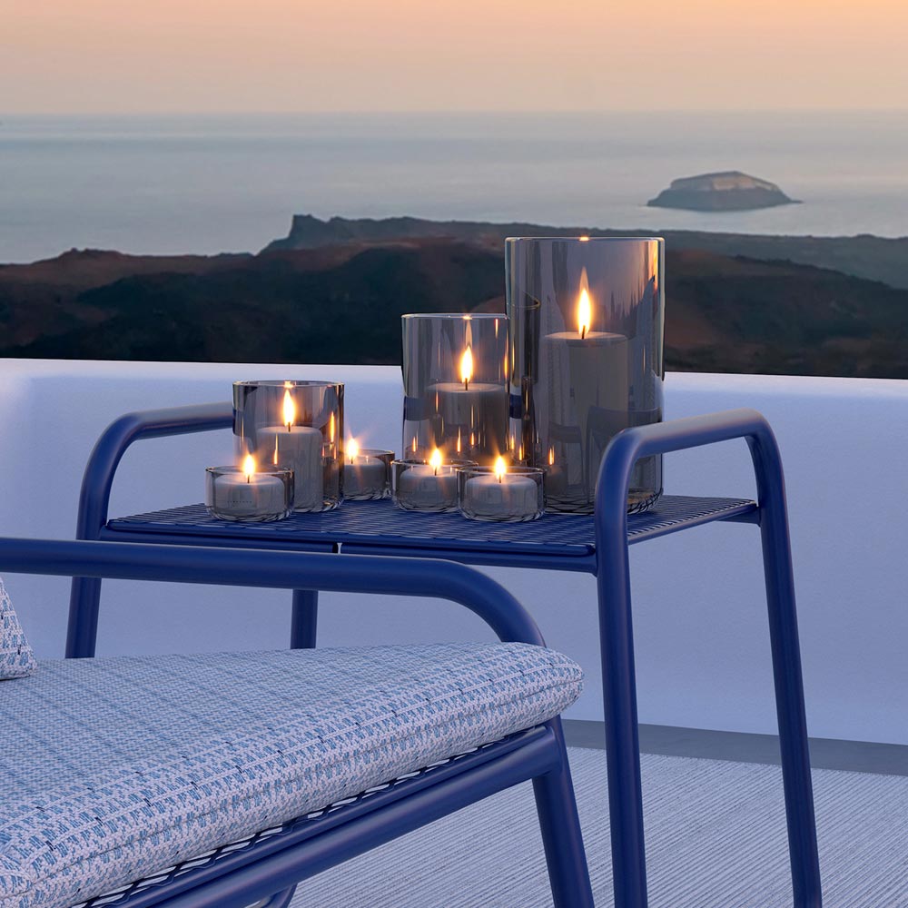 outdoor coffee table has a rigorous design with a decidedly contemporary taste, but the solid and imposing figure is softened by the rounded legs.