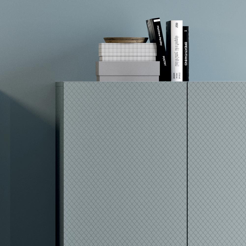 wooden doors in the original Rombo fog matt lacquered finish with a quilted motif. Inside the door compartments, which can be opened with