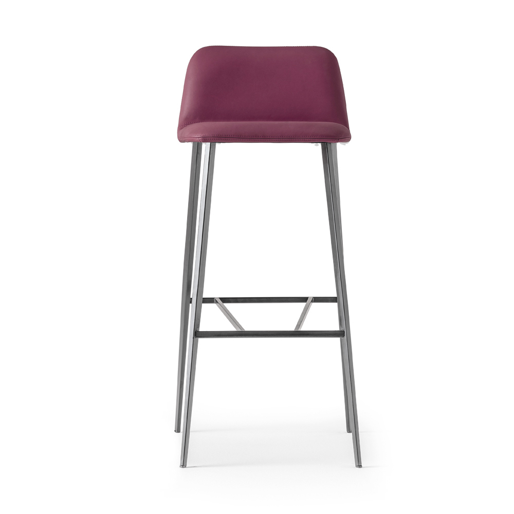 High stool made in Italy with structure in painted metal with lead anthracite finish and padded shell covered in leather . A chair with simple but original features characterized by functionality and unrivaled beauty, ideal for customizing and making the furnishing of kitchens or contract environments unique in which to create a refined atmosphere and a wonderful harmony between styles. Thanks also to the choice of using leather for its upholstery, this stool has a particularly fascinating soul that gives it a sober, discreet and classy design.