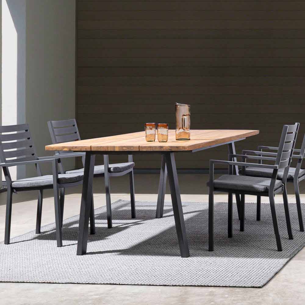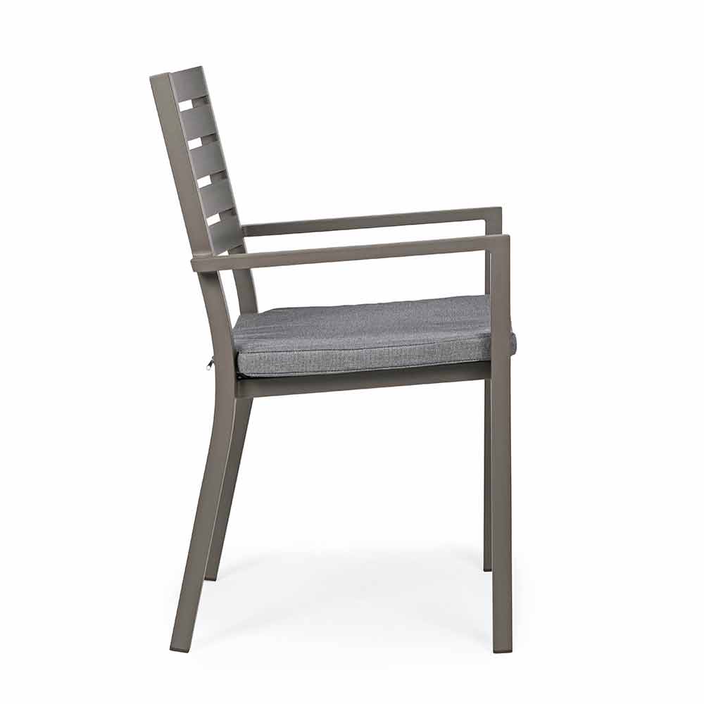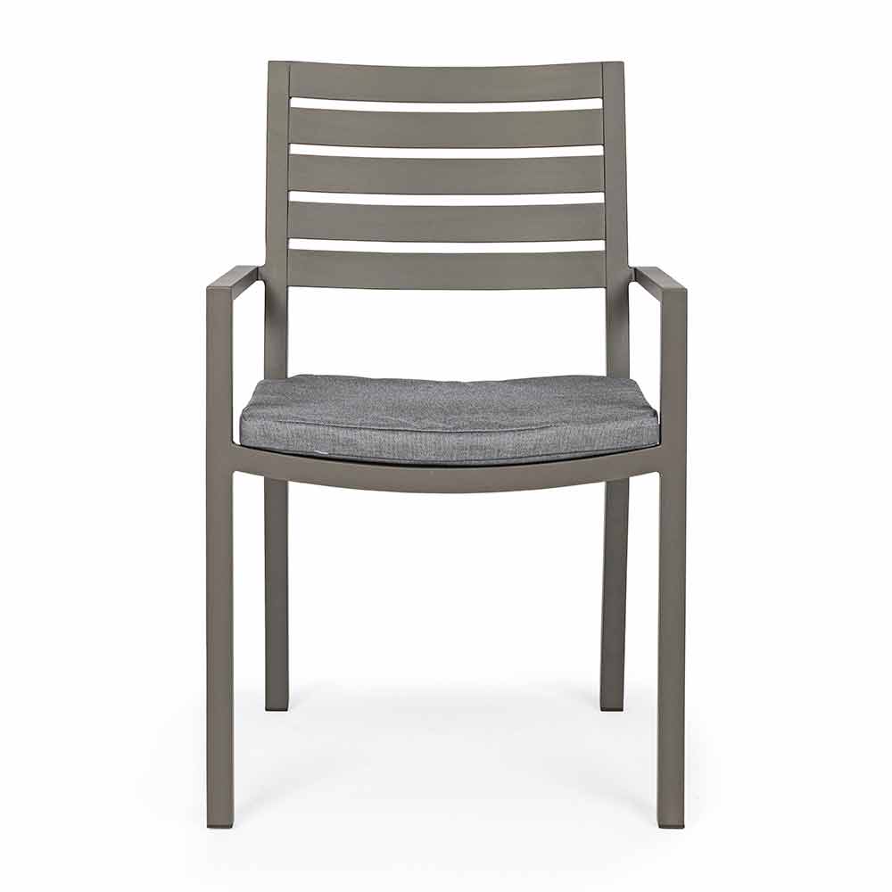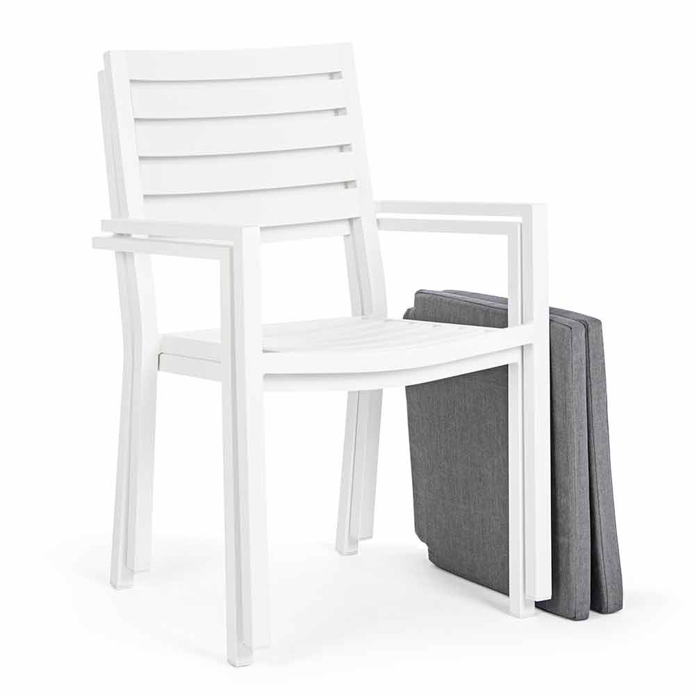Aluminum frame, powder coated (polyester), removable cushions with Spun Poly fabric (polyester). Stackable . Structure finishes available: