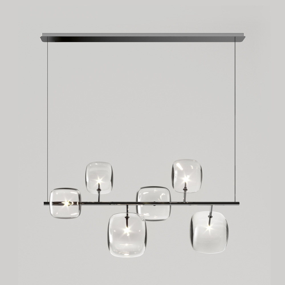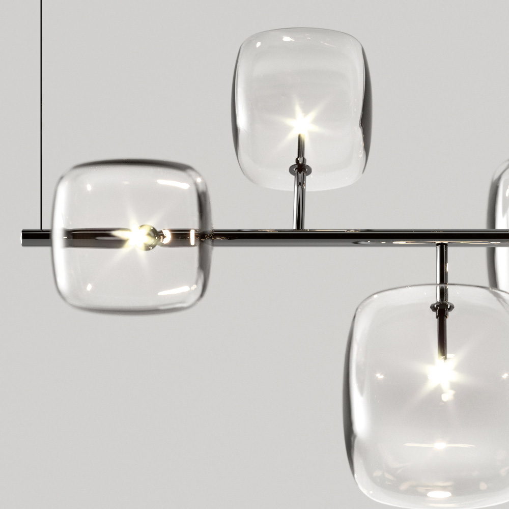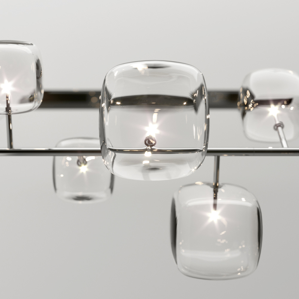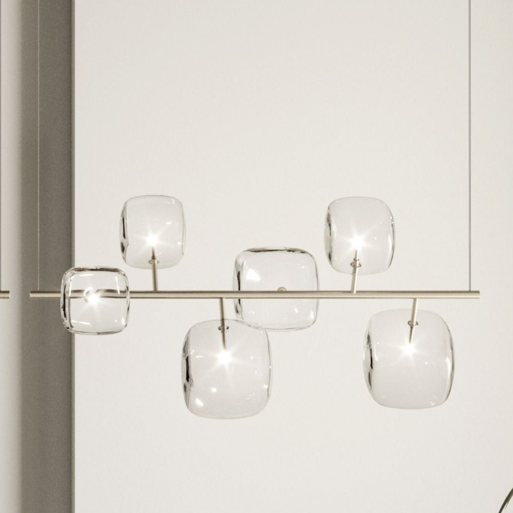 Horizontal pendant lamp with metal structure and 6 cubic and rounded structures in transparent blown Pyrex glass with 1 dimmable G4 3000K LED bulb inside each.