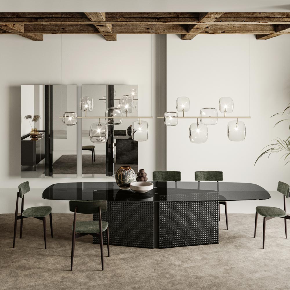 This contemporary chandelier stands out for its unique design and ability to become the focal point of any modern space. Composed of transparent glass spheres suspended at different heights, the chandelier offers a light diffusion that is as functional as it is artistic .