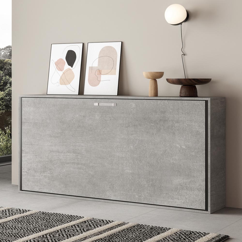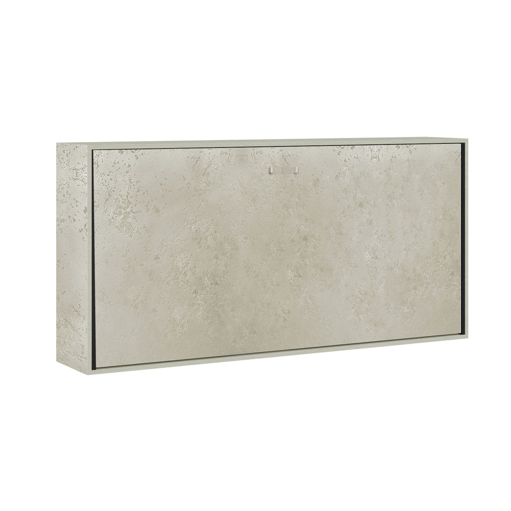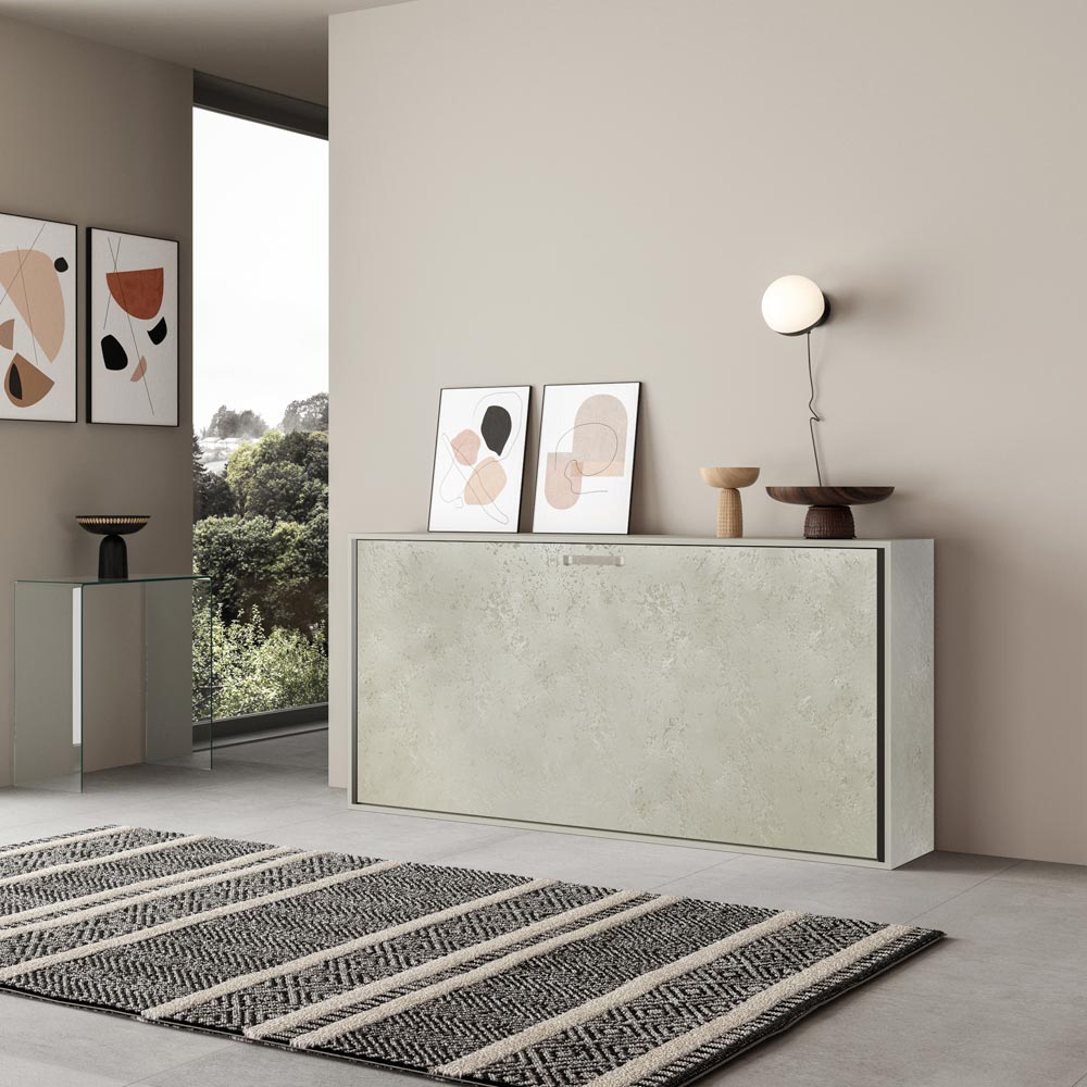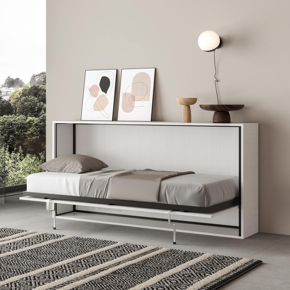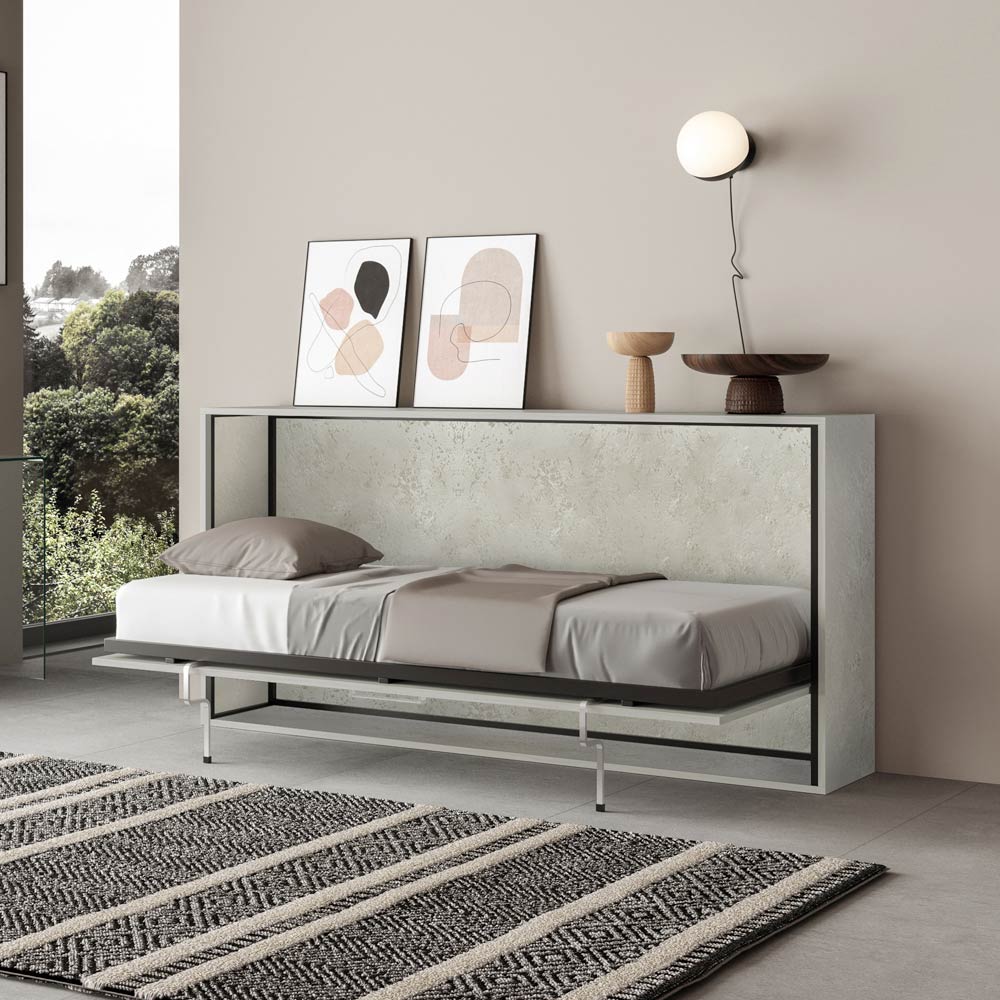 Horizontal foldaway bed made with a structure in 18 mm thick ennobled particle board panels, bed base structure in reinforced iron painted with epoxy powder in embossed aluminium colour.