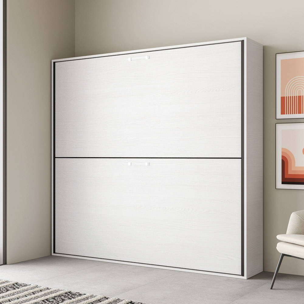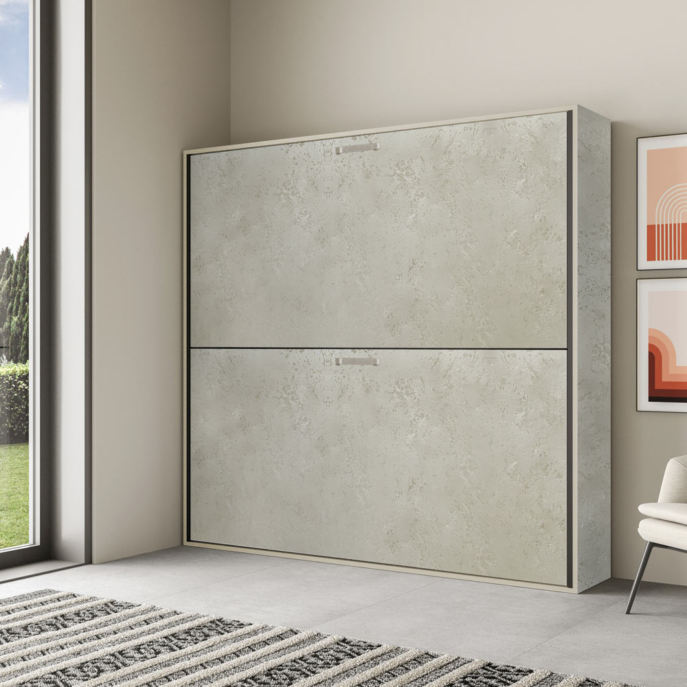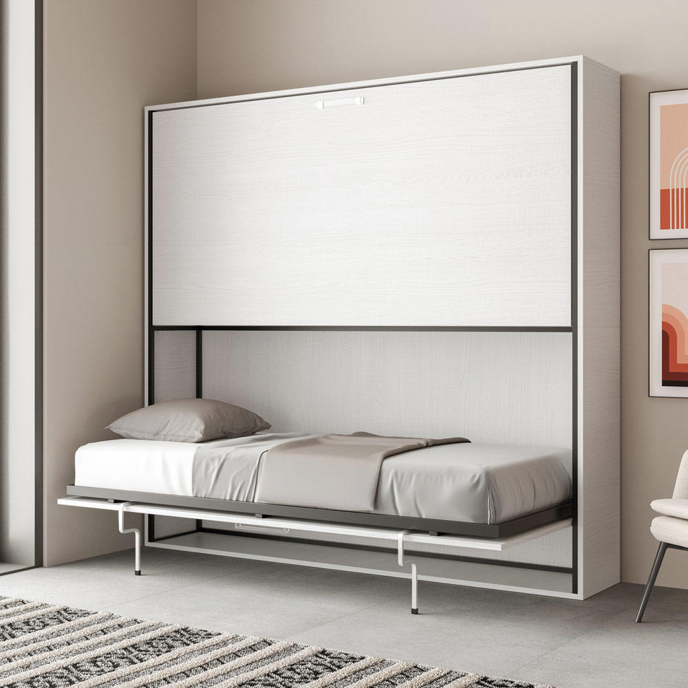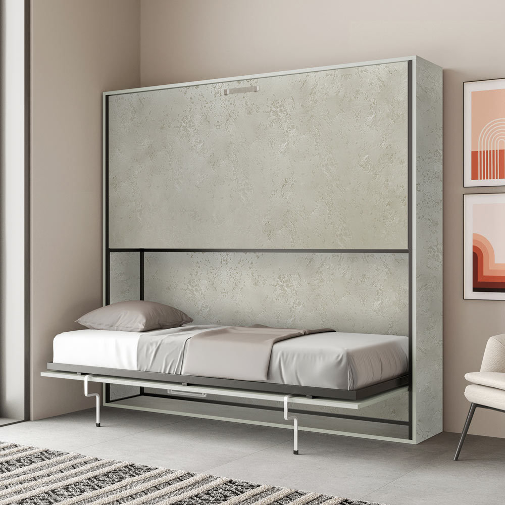 Horizontal foldaway bed made with a structure in 18 mm thick ennobled particle board panels, bed base structure in reinforced iron painted with epoxy powder in embossed aluminium colour.