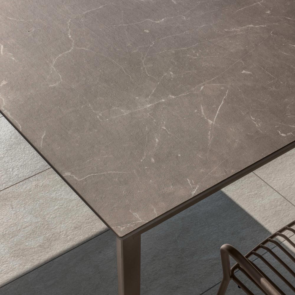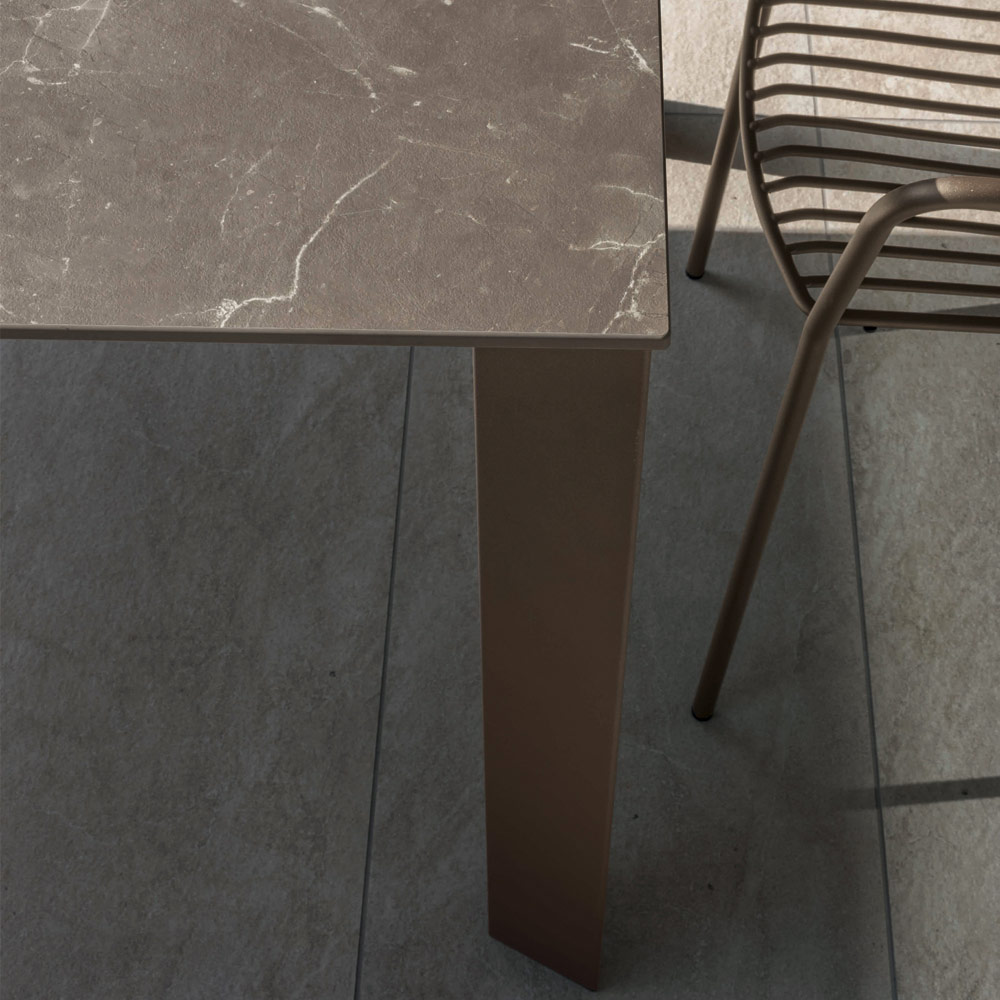 Garden table Ā  with embossed bronze painted metal structure and rectangular hpl top. A piece of furniture handcrafted in Italy with high performance materials resistant to atmospheric agents that ensure a functional and long-lasting result together with a contemporary , elegant and refined aesthetic.