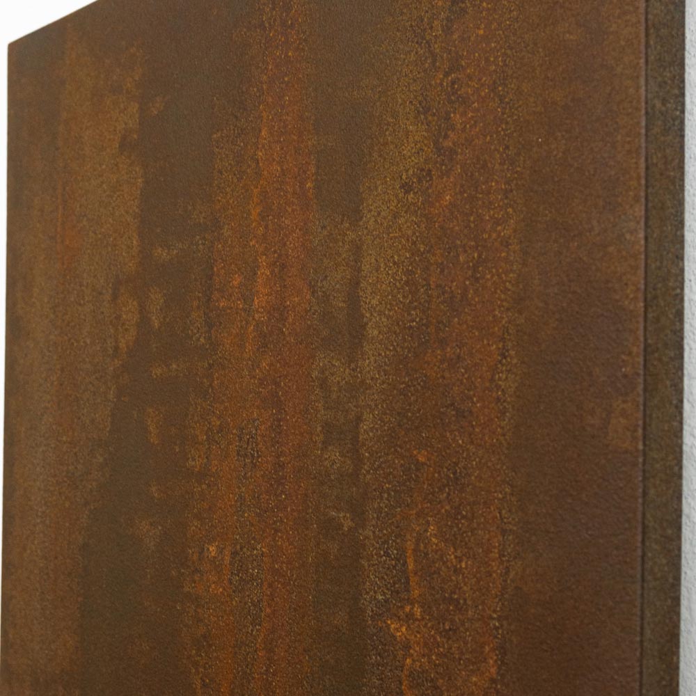 creation of the corten effect begins with the application of a pigmented paint rich in ferrous aggregates which begins the transformation of the surface thanks to the nebulization of a contrast substance to activate the reaction of the pigments.